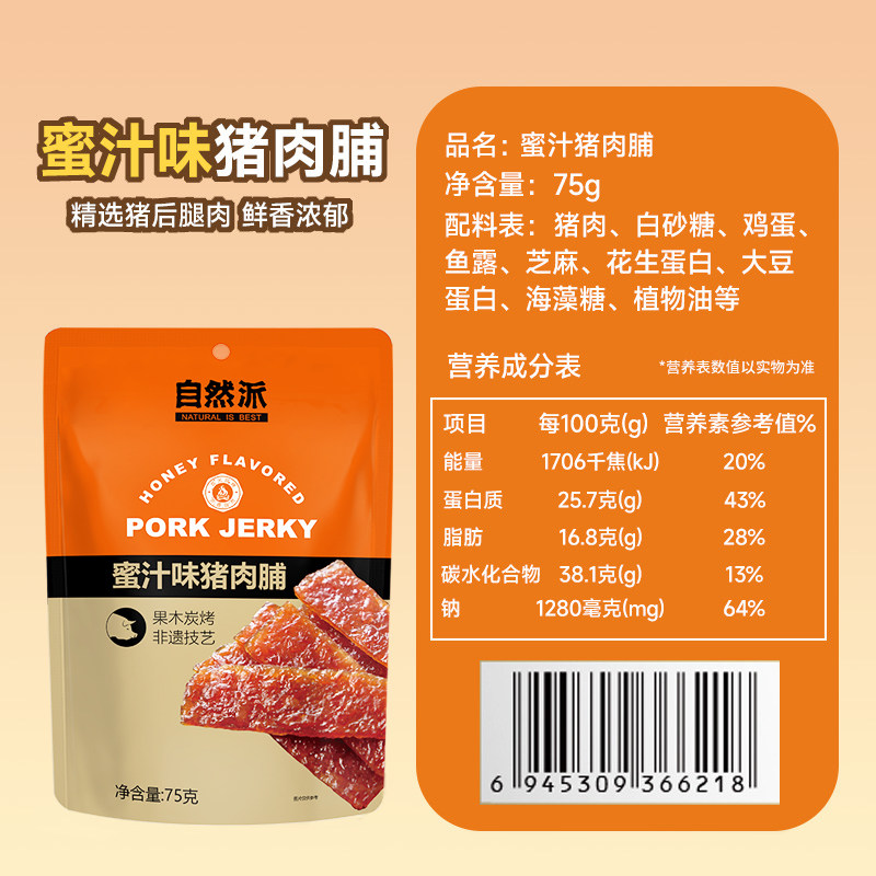 自然派猪肉脯精选优质猪后腿肉,采用传统工艺与现代技术结合,经秘制酱料腌制、低温慢烤而成,口感紧实有嚼劲,肉香浓郁,咸甜适中。每袋75g独立小包装,方便携带与分享,开袋即食,是办公室、旅行、追剧的理想零食。源自广东地道风味,传承经典配方,无添加防腐剂,健康安心。适合全家享用,尤其受儿童喜爱,既能解馋又富含蛋白质。无论是作为日常休闲零食,还是馈赠亲友的特产佳品,自然派猪肉脯都以真材实料和自然风味赢得口碑,让您一口回味岭南美味。