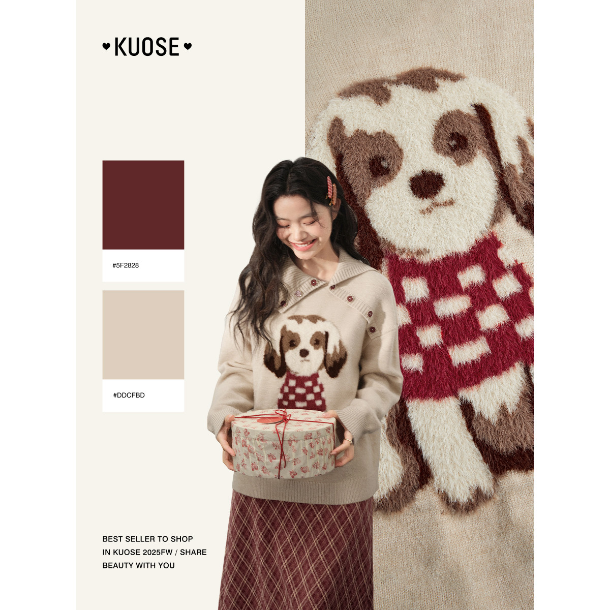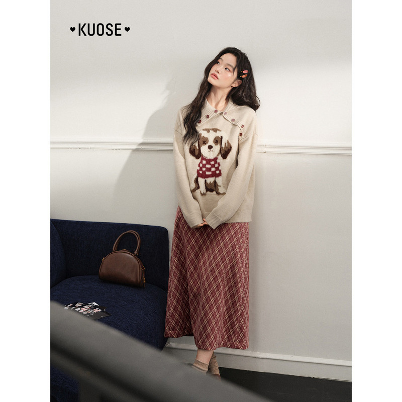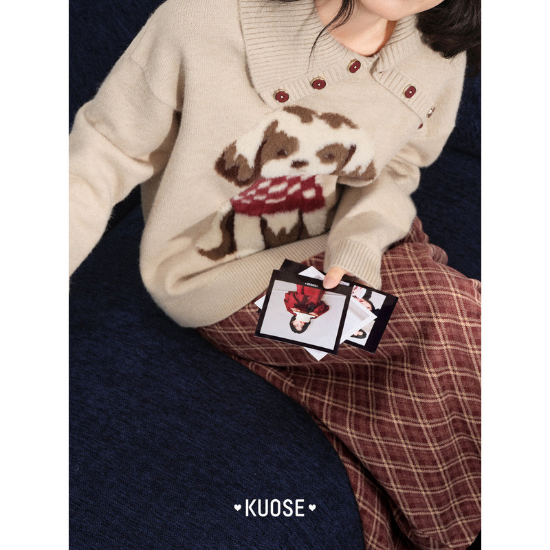 天猫阔色杏色独特漂亮翻领毛绒小狗针织衫女装秋冬季新款内搭毛衣上衣