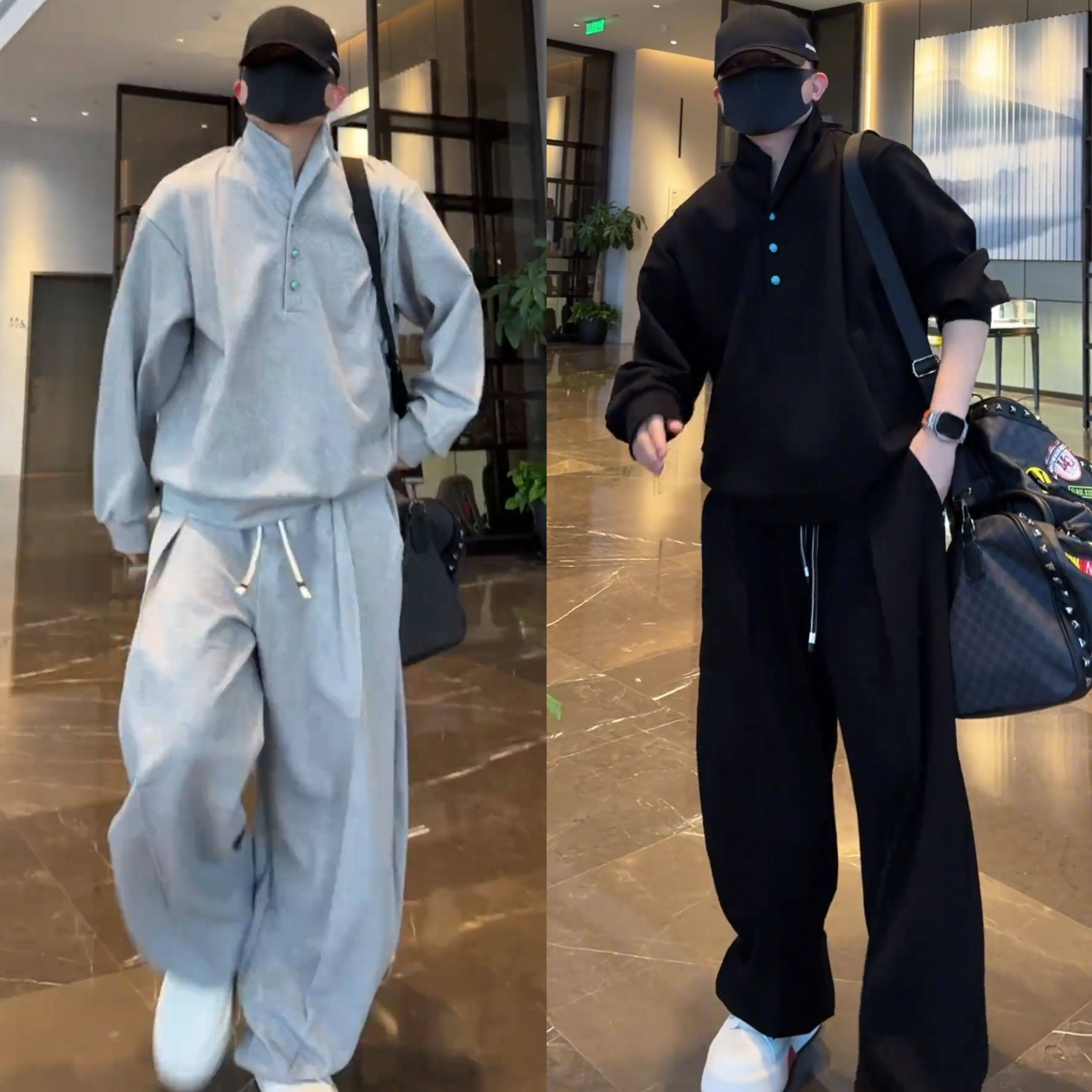 淘Holocene美式潮牌氛围感纯色假两件卫衣套装男秋季老钱一整套搭配