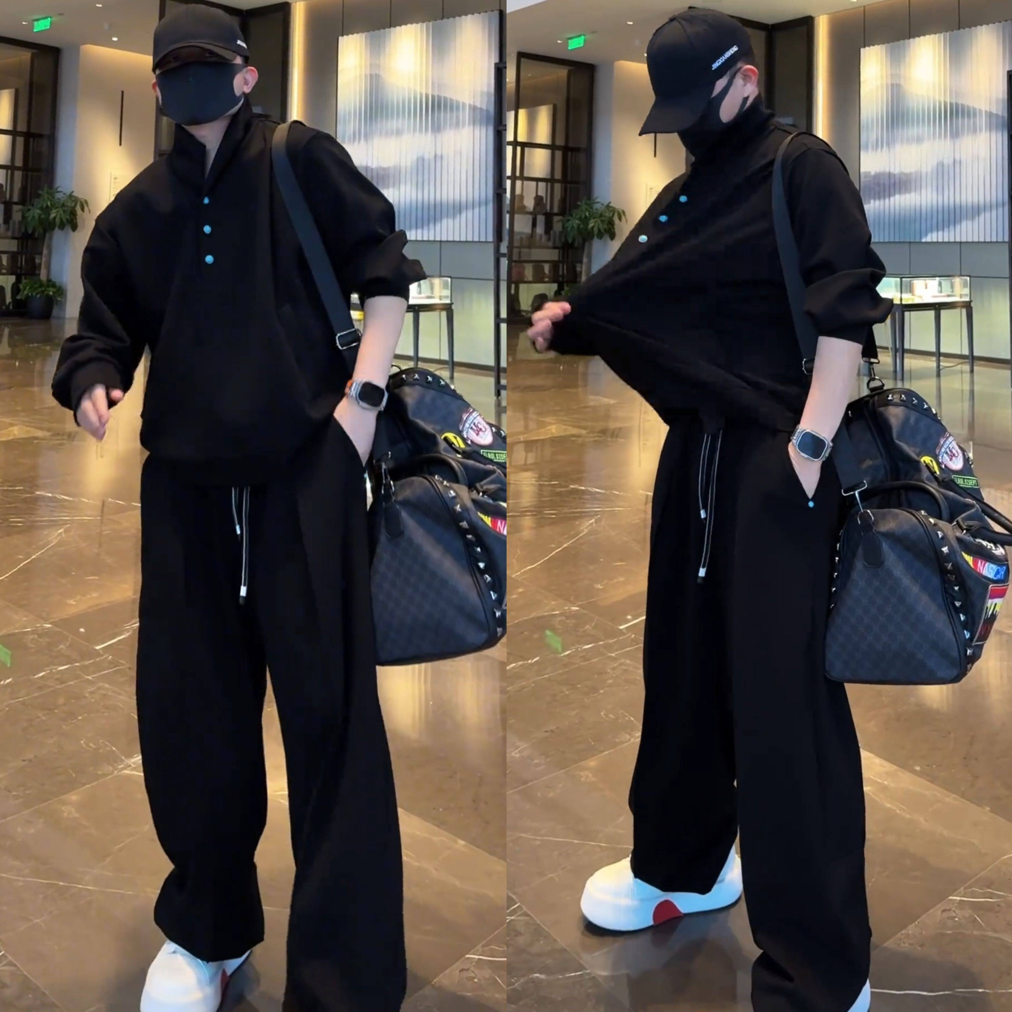 Holocene美式潮牌氛围感纯色假两件卫衣套装男秋季老钱一整套搭配