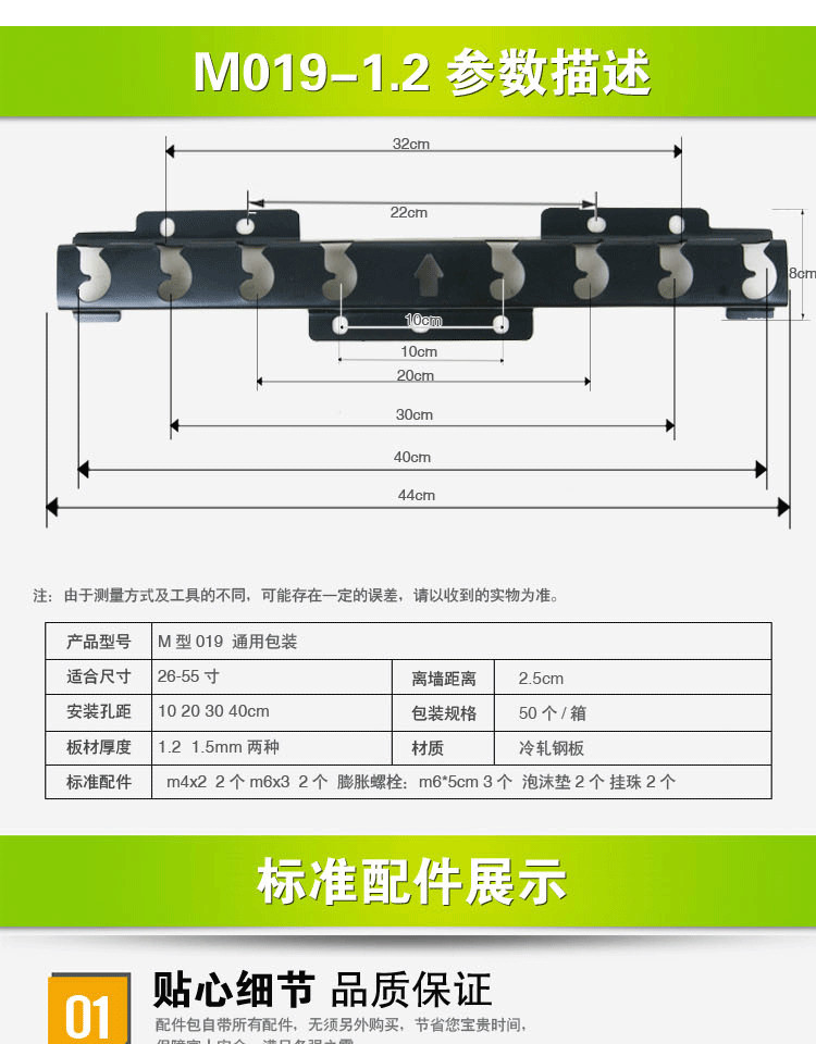 M型019电视挂架专为康佳、长虹、乐视等品牌的32-55英寸M型018系列电视设计,兼容性强,安装便捷。采用高强度钢材制造,结构稳固,承重性能优异,确保电视安全牢固地悬挂于墙面。支持多角度调节,可实现上下俯仰及水平旋转,满足不同观看需求,提升观影体验。壁挂设计节省空间,让客厅更整洁美观。安装孔距符合VESA标准,适配多种型号,操作简单,附带详细安装说明与配件。无论是家庭客厅还是办公场所,M型019挂架都是理想选择,兼顾实用性与安全性,助您轻松打造舒适视听环境。