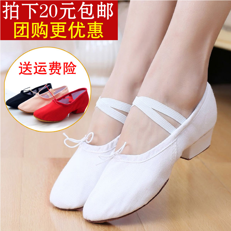 淘宝成人舞蹈鞋女软底练功鞋中跟跳舞鞋帆布教师鞋真皮带跟民族舞白黑
