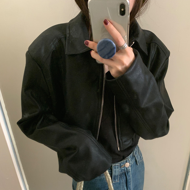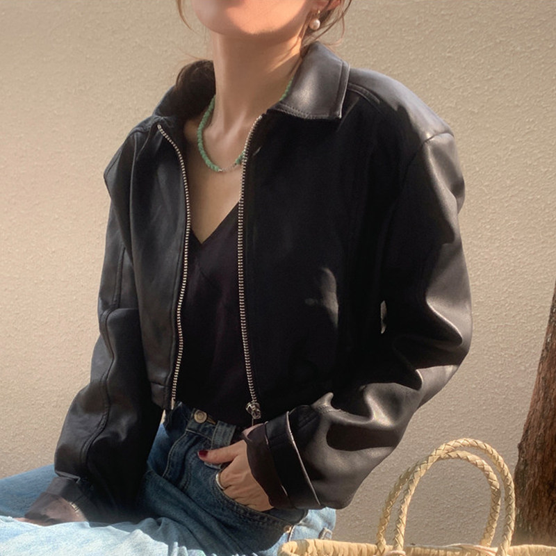 淘宝韩国chic秋季美式小众翻领拉链式PU皮宽松百搭长袖短款皮衣外套女