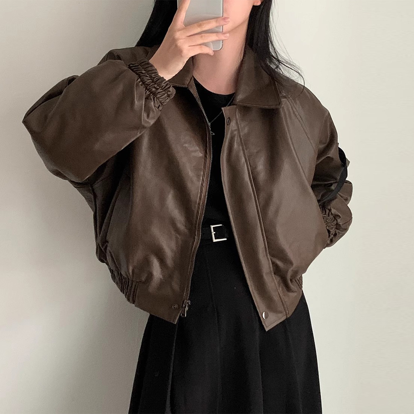 淘H006纯色显瘦短款外套上衣圆领拉链春季新款2023机车服长袖女皮衣