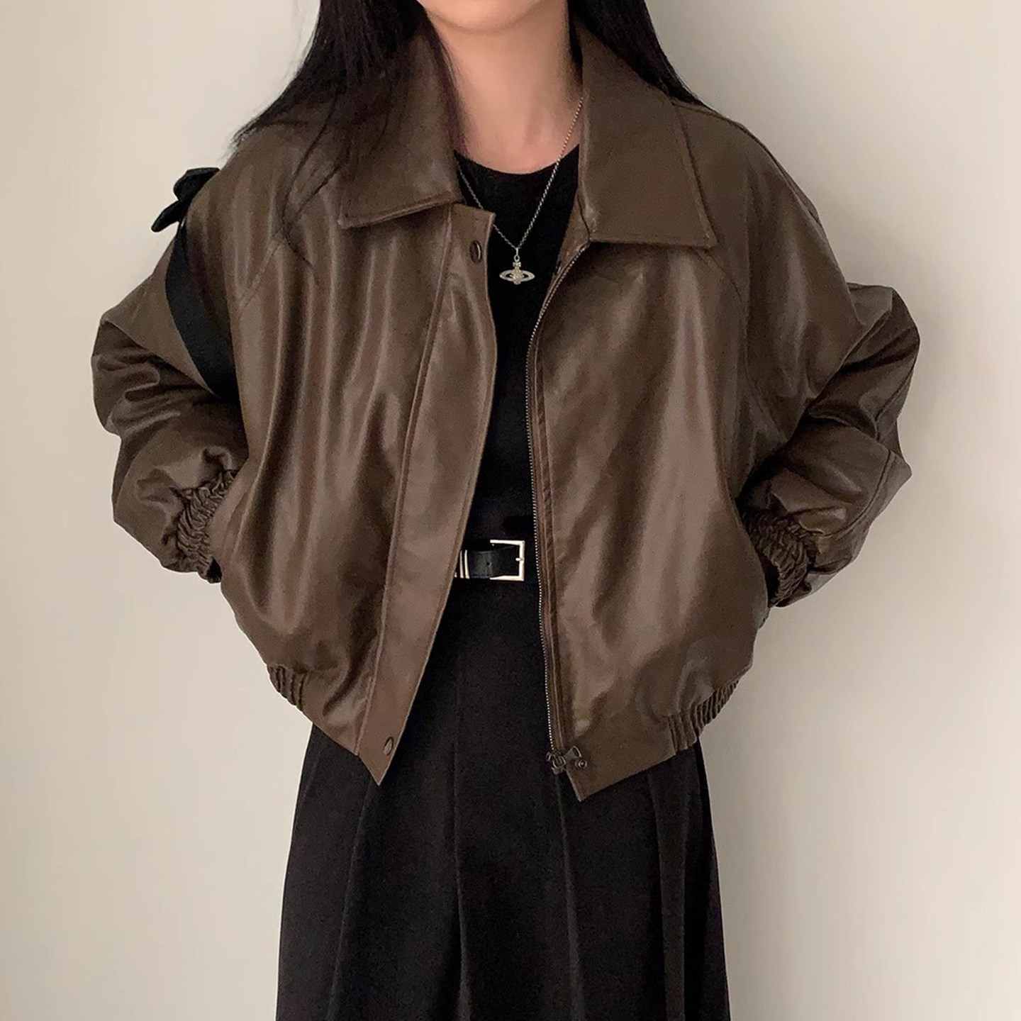 KBNE2026新款黑色皮衣外套女高级感风衣短款夹克修身复古上衣春秋