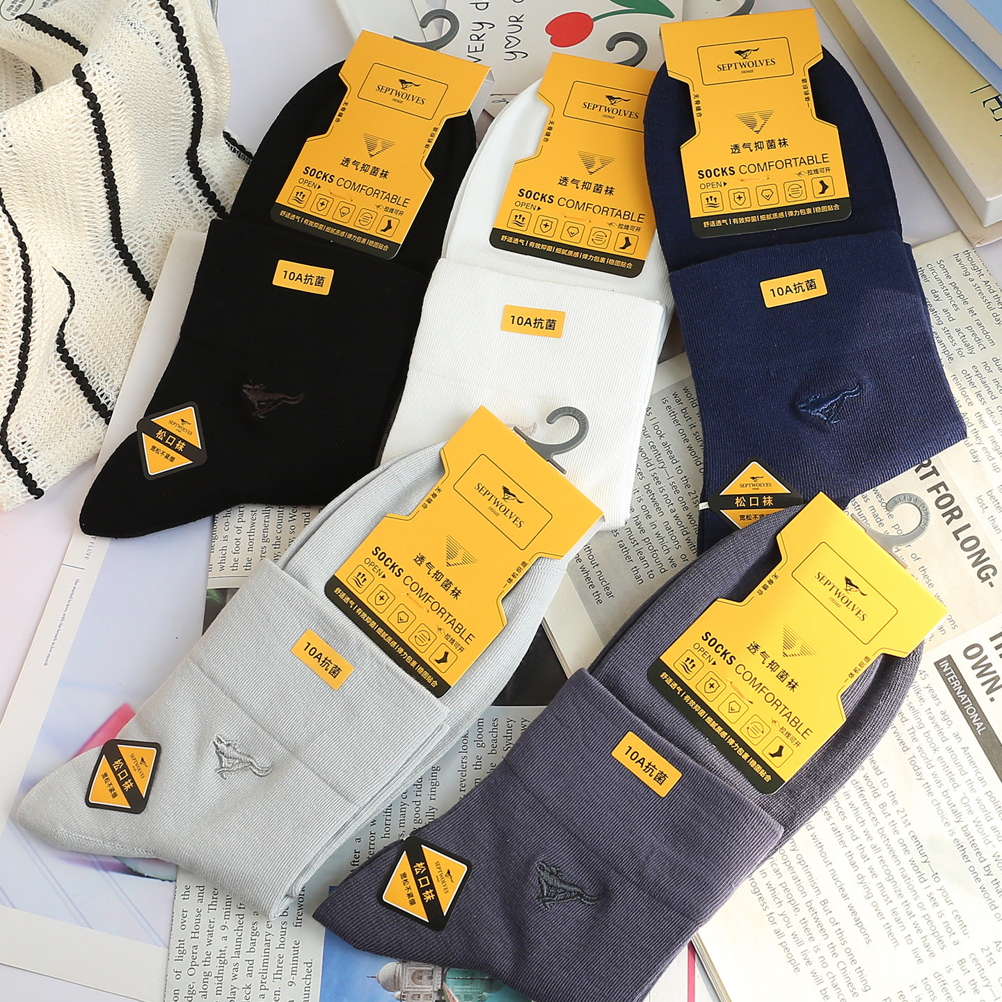 七匹狼男士袜子纯棉中筒全棉袜黑白色男袜商务透气吸汗抗菌防臭脚