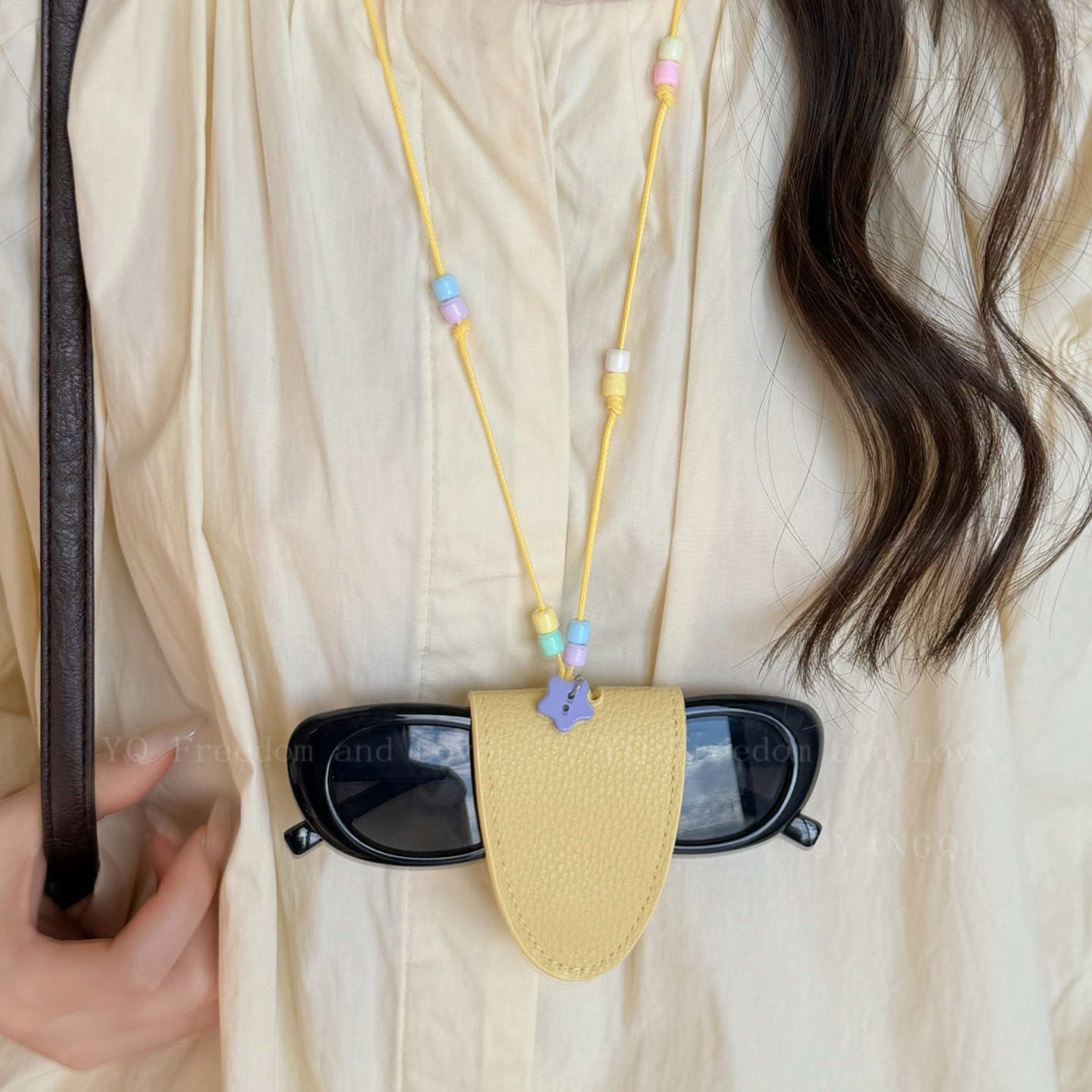 这款原创设计的皮质咖色串珠眼镜夹,专为海边度假打造,融合时尚与实用。精选优质咖色皮革与温润串珠结合,质感高级,复古中透出优雅气质。巧妙设计成可夹式结构,轻松固定墨镜,解放双手,适合三亚等海滨旅游场景。长款挂脖链设计,佩戴舒适不勒颈,既是实用配件,也是吸睛项链配饰。无论是沙滩漫步、拍照打卡,还是遮阳防晒,都能轻松驾驭,展现独特度假风情。百搭造型,适配多种风格穿搭,是旅行中不可或缺的时尚单品,让旅途更轻松、更出彩。