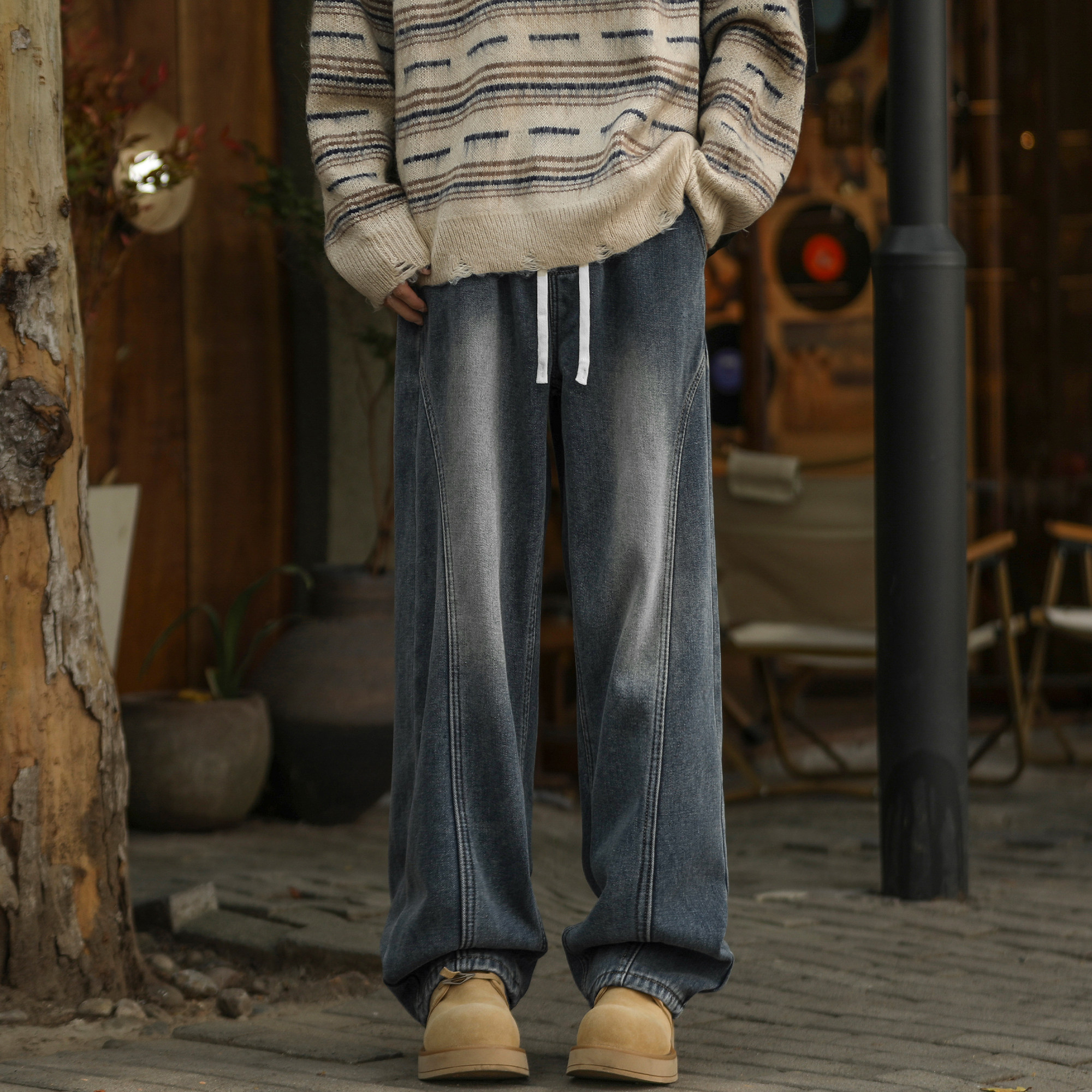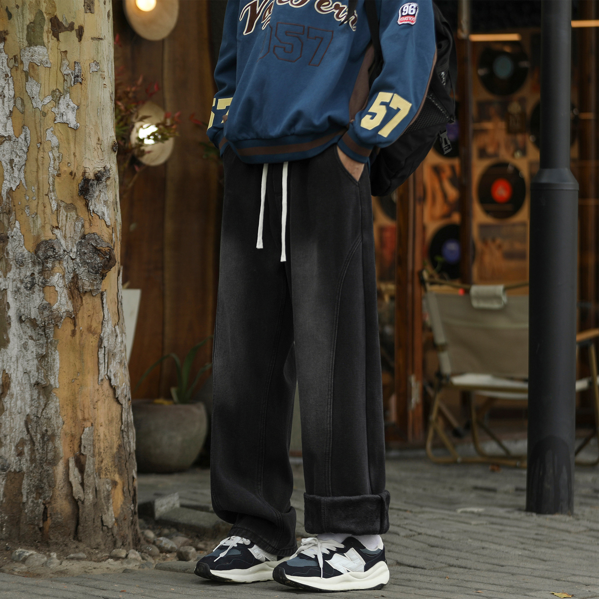 淘宝二更美式弯刀加绒直筒牛仔裤男秋冬季新款宽松休闲风阔腿男生长裤
