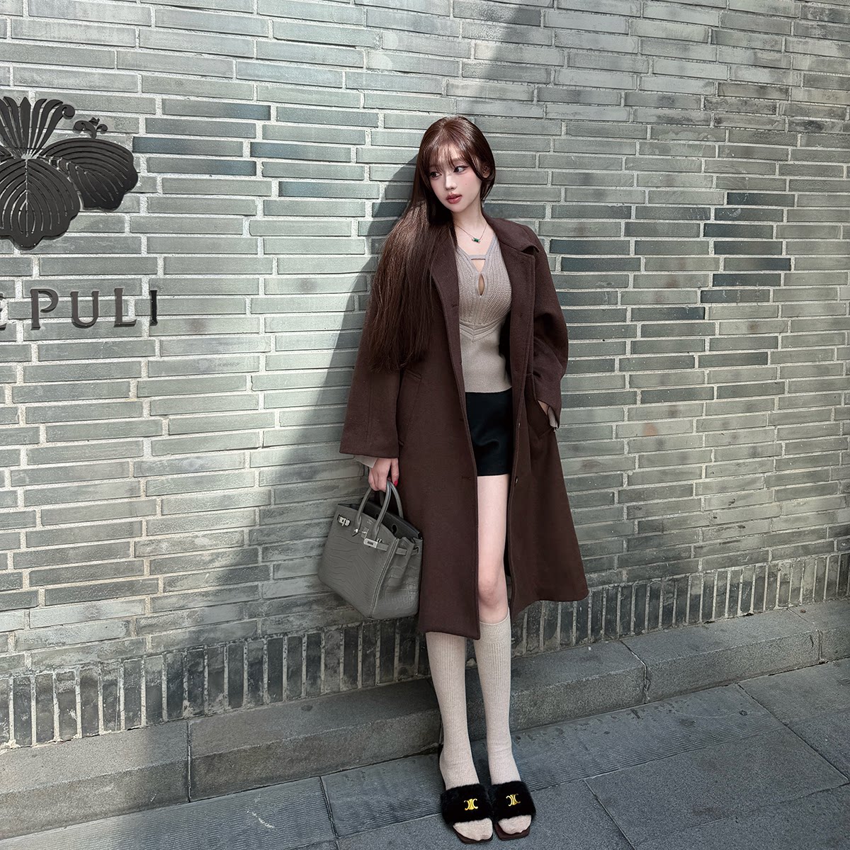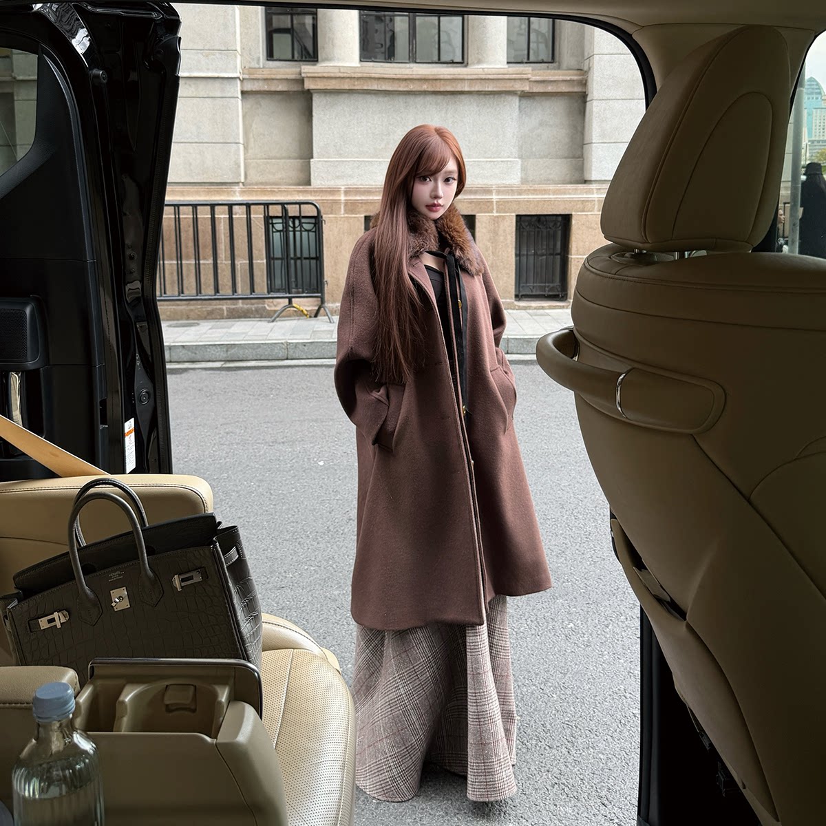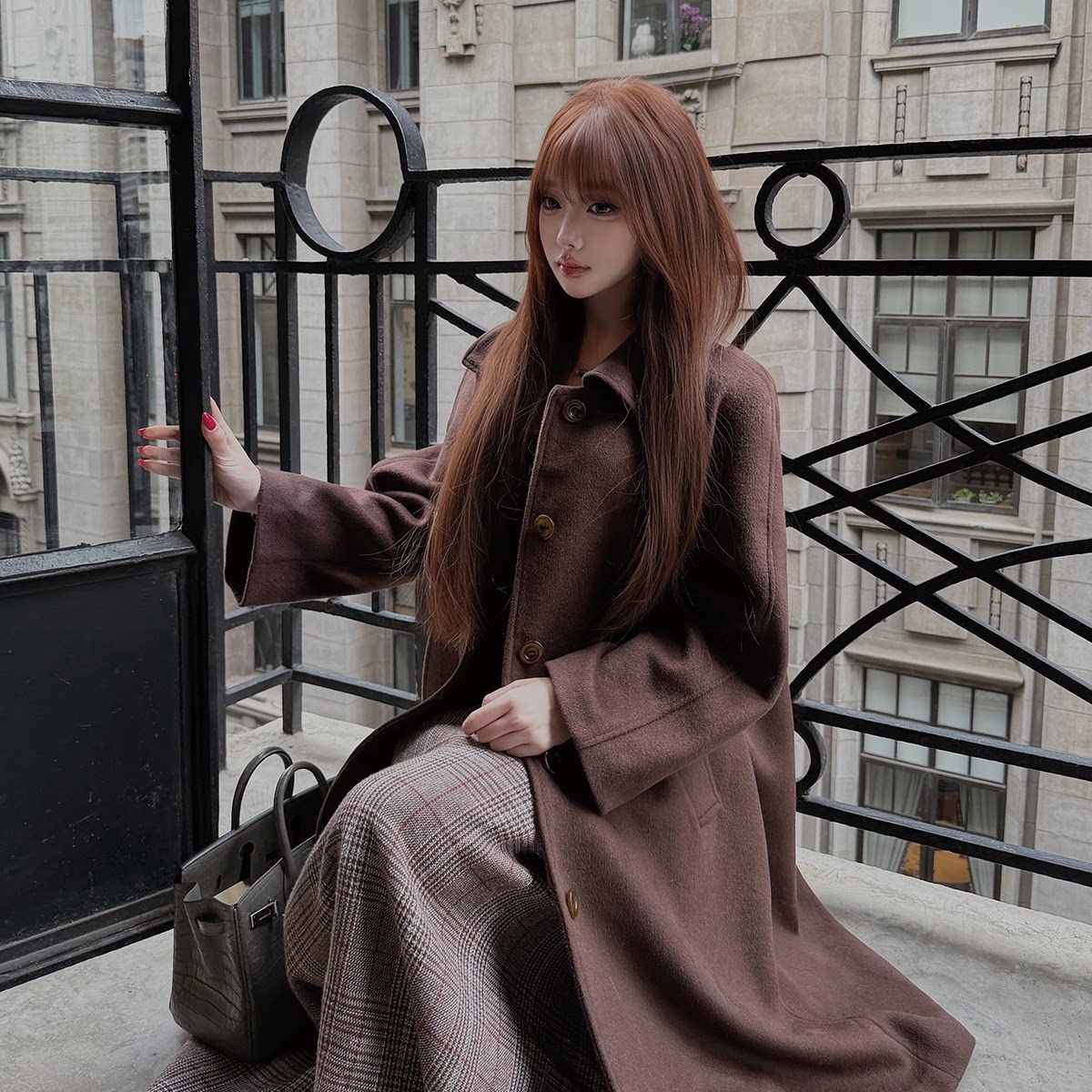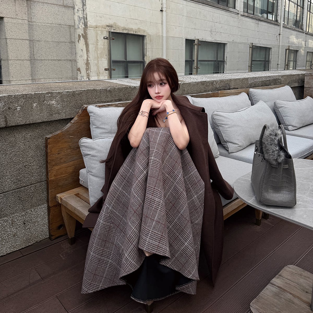 淘宝LIN BOUTIQUE 复古氛围感大毛领巧克力棕长款毛呢落肩风衣外套女