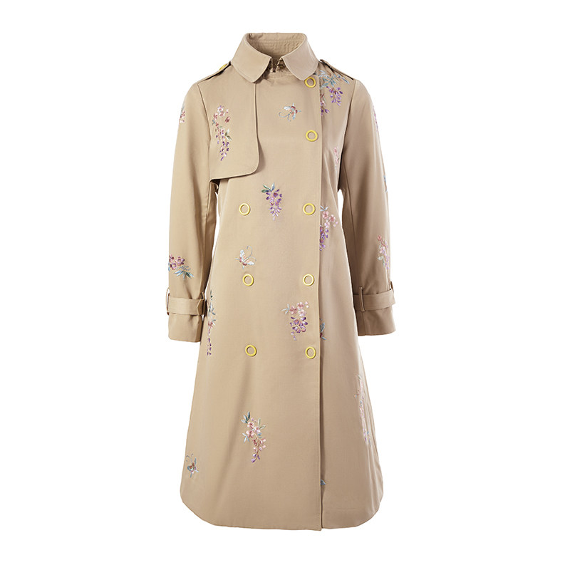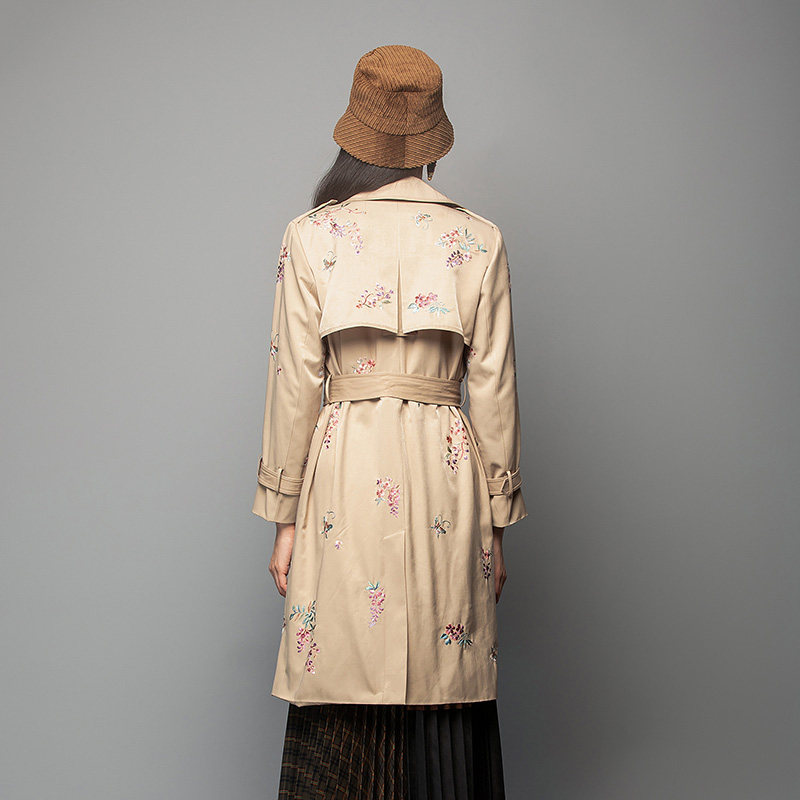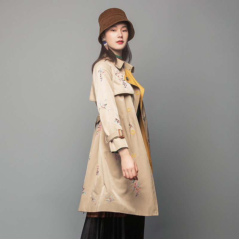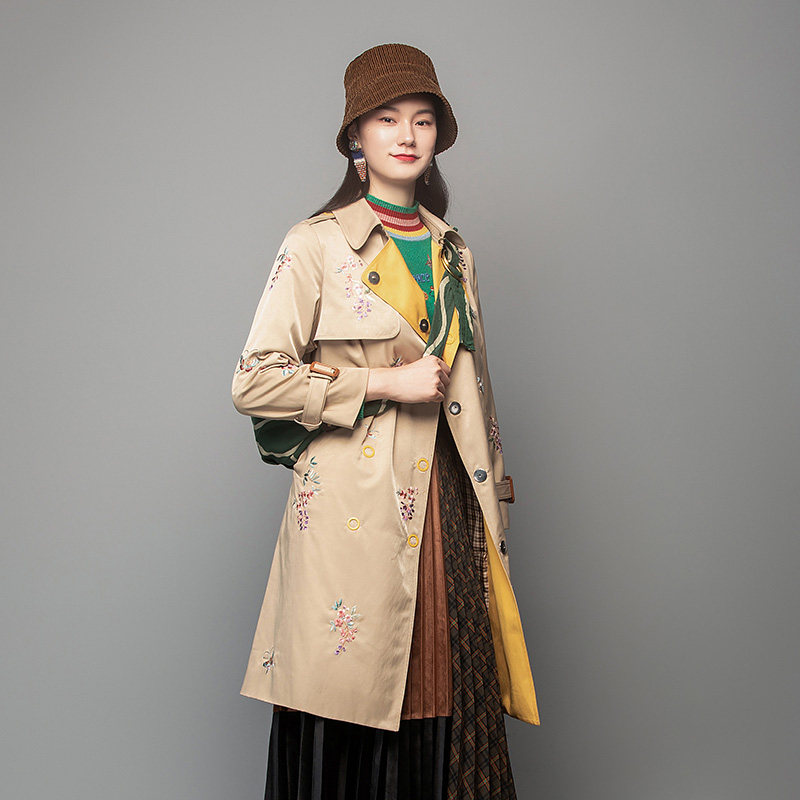天猫渔牌风衣女款2023新款秋双排扣绣花宽松长款过膝风衣外套FGFC3002