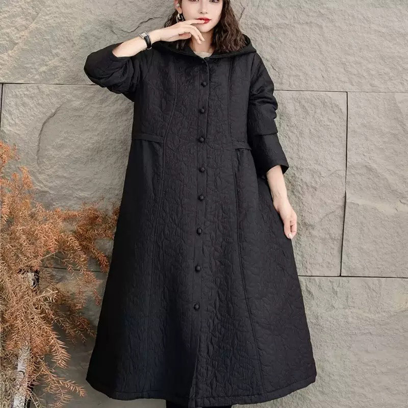 淘宝复古提花加厚中长款连帽风衣女秋冬新款文艺大码显瘦国风外套