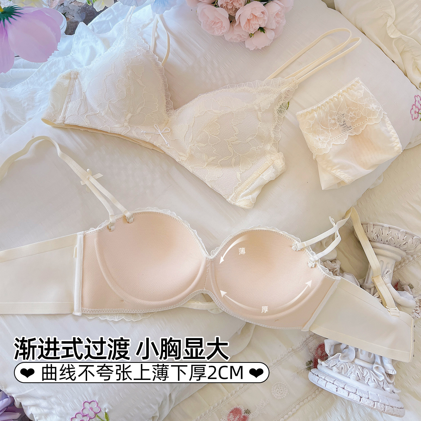 天好奇蜜斯大胸显小内衣女纯欲蕾丝半杯夏薄文胸罩套装防下垂软钢圈