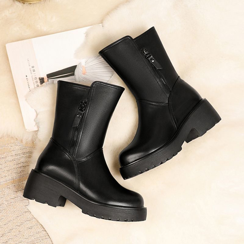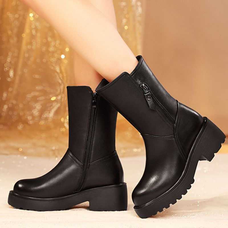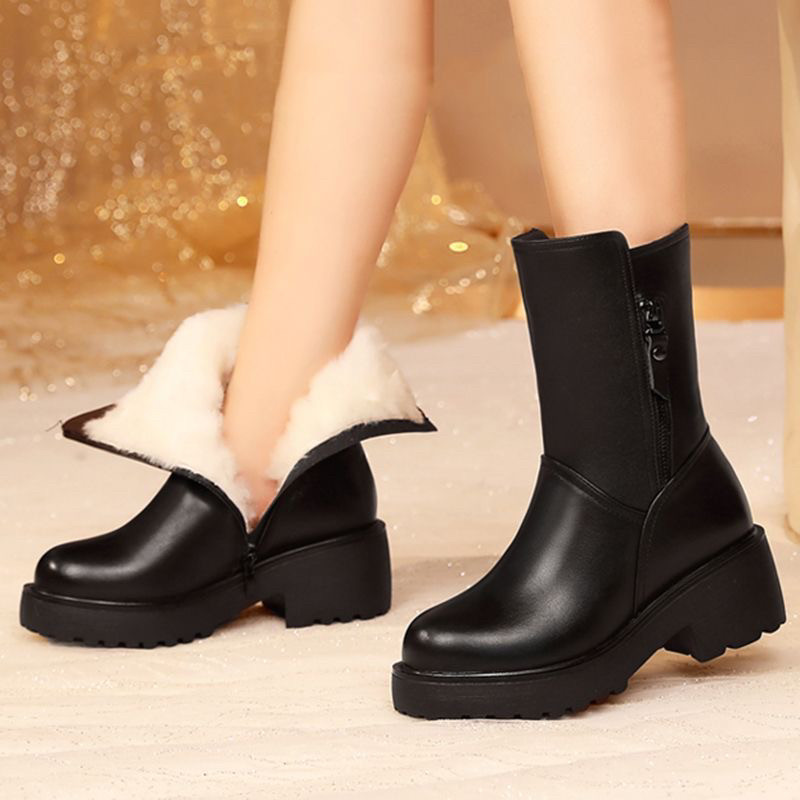 淘宝薏尓康冬季加绒厚底妈妈棉靴中筒女士真皮棉鞋女式皮鞋加厚雪地靴