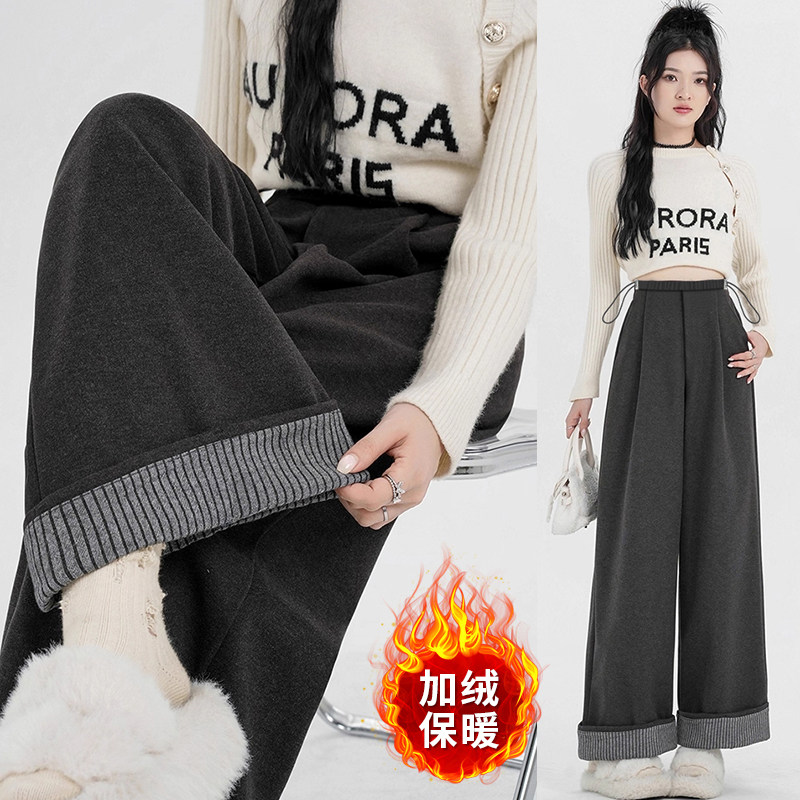 淘孕妇针织阔腿裤子不勒肚子秋冬季加绒加厚外穿孕期垂感拖地保暖裤