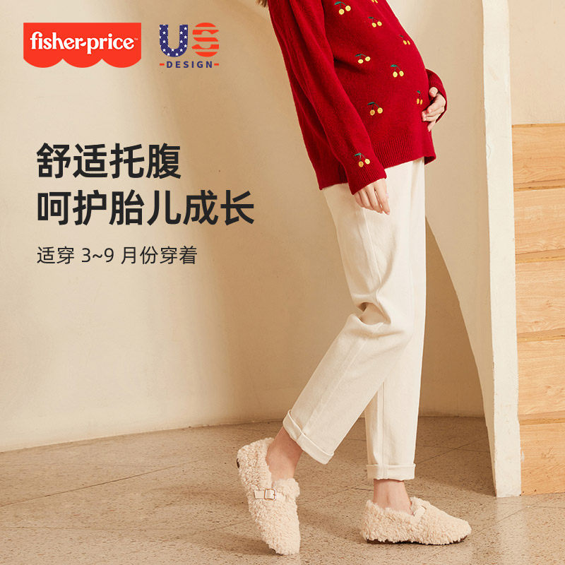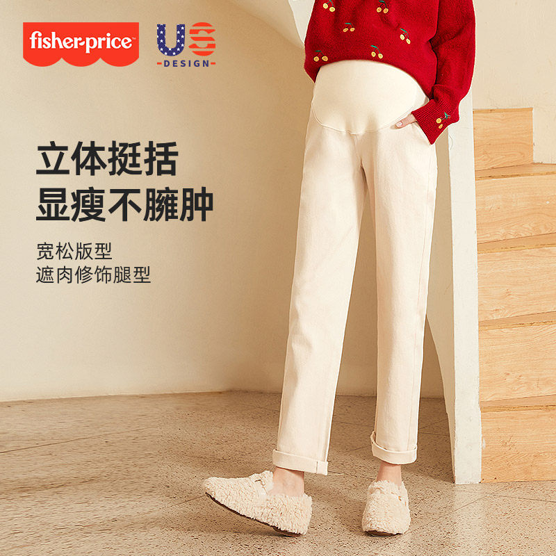 天猫费雪纯棉孕妇裤子秋冬季外穿大码加绒加厚直筒牛仔裤小个子休闲裤