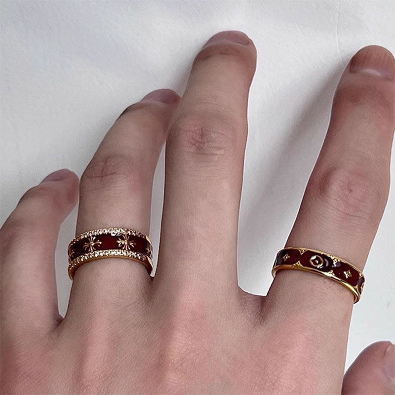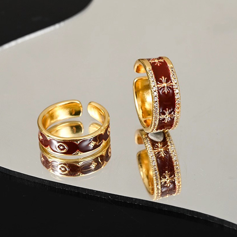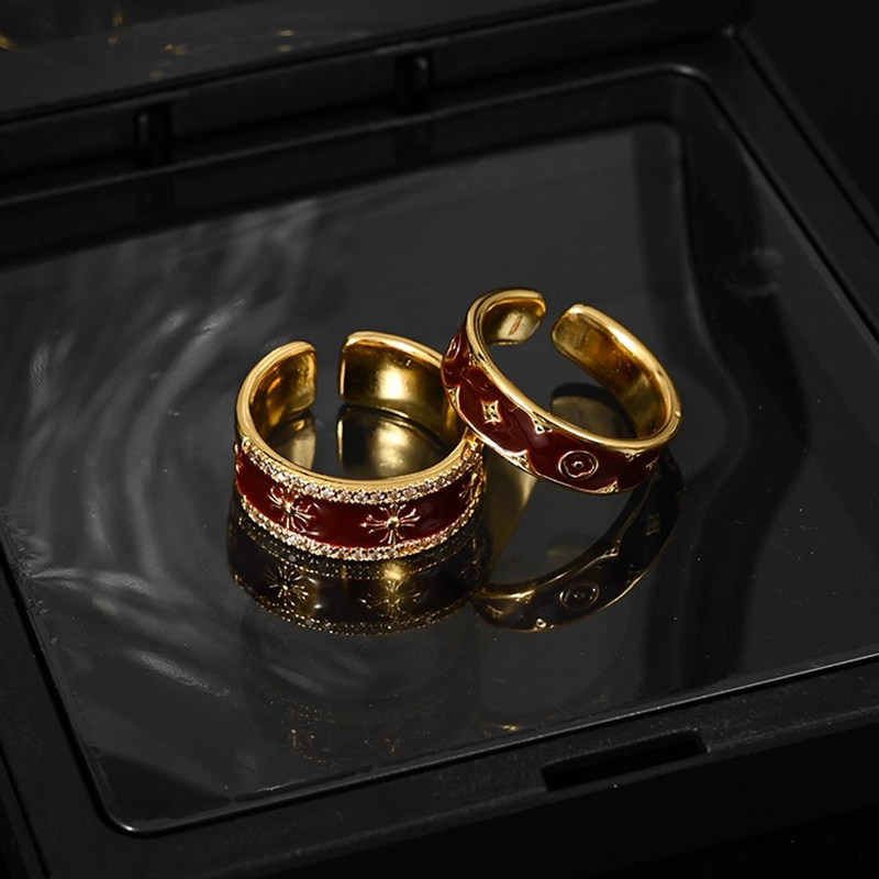 天猫老花酒红金色复古开口戒指小众设计轻奢高级感珐琅开口指环手饰品