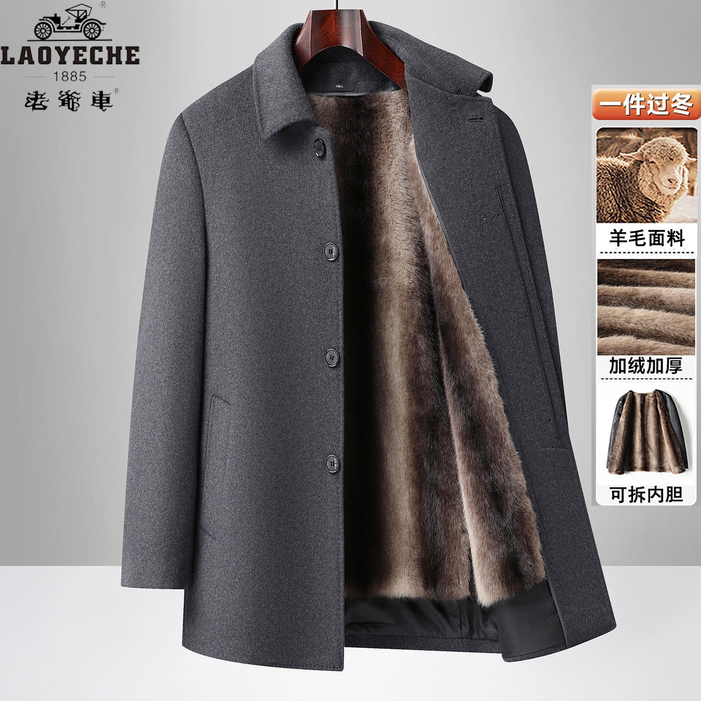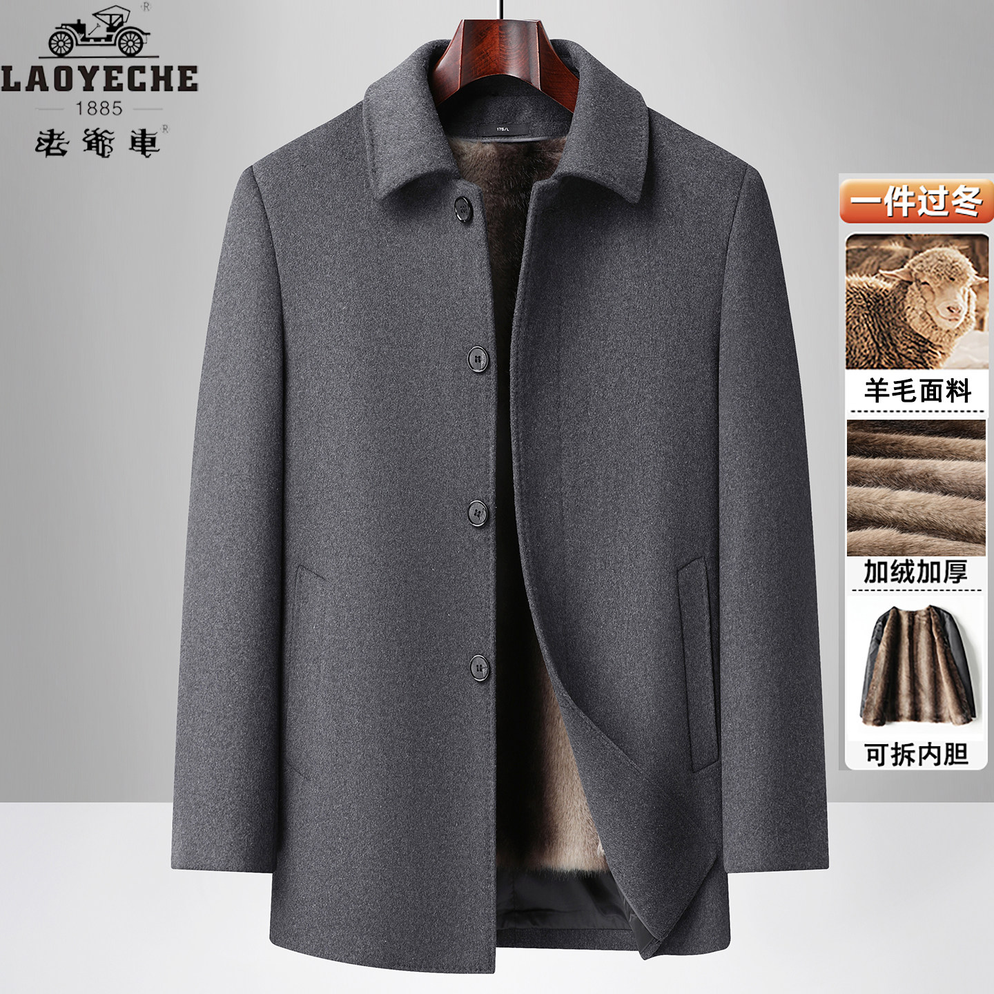 淘宝老爷车中老年男士羊毛呢大衣可拆加绒内胆爸爸冬装翻领呢子外套厚