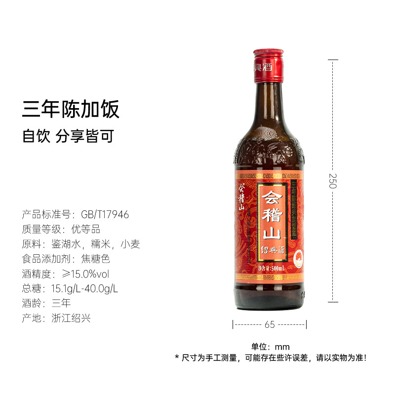 天猫会稽山官方 三年陈酿花雕酒500ml*8瓶绍兴黄酒糯米加饭酒正宗老酒