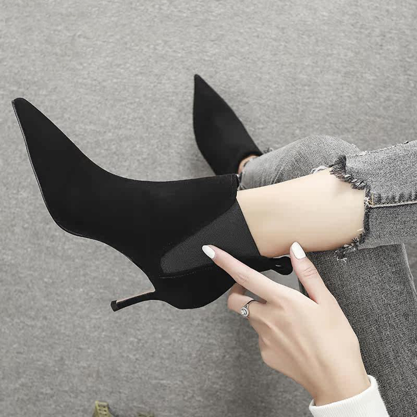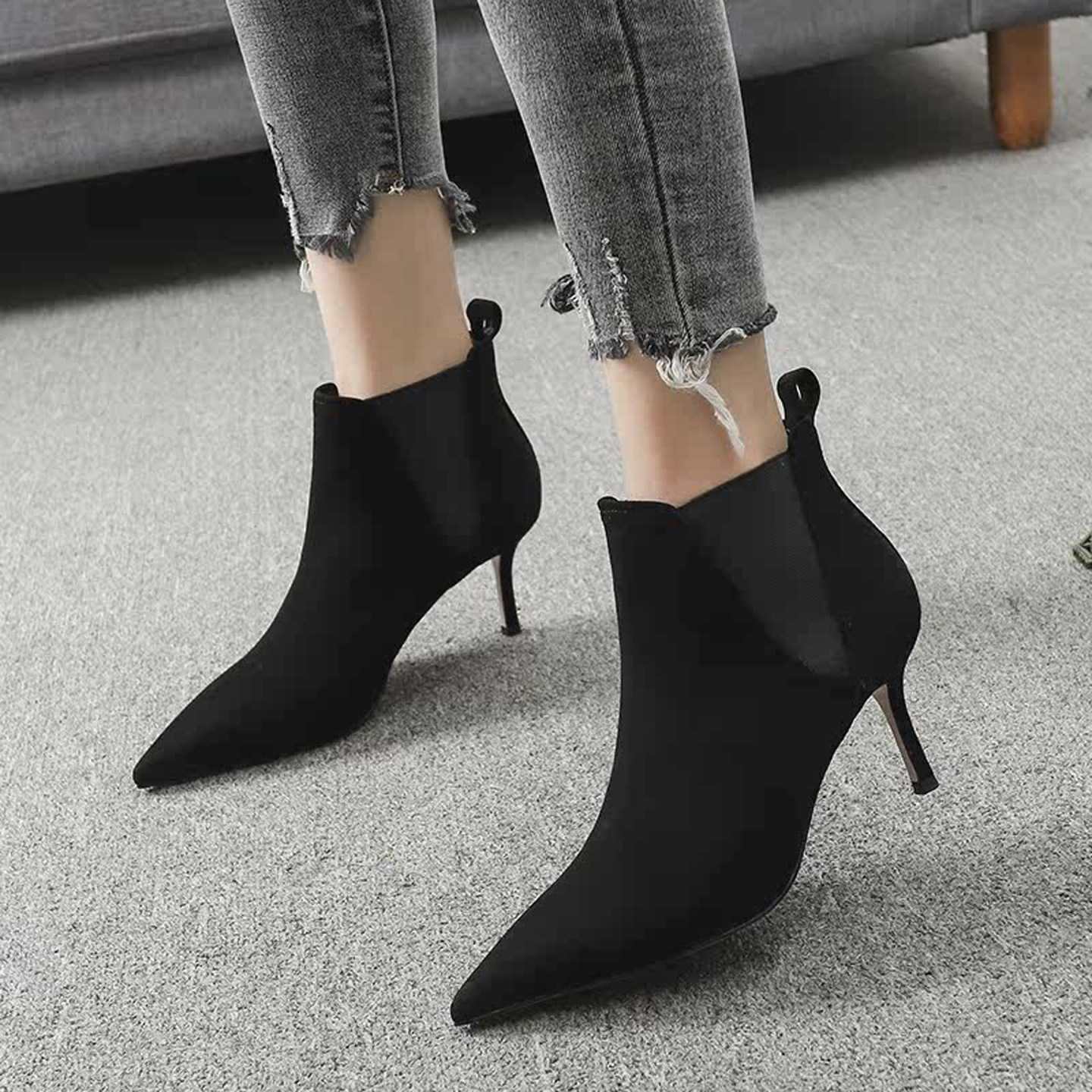 淘欧美2025秋冬季新款金属尖头高跟短靴细跟显瘦弹力靴百搭短筒女靴