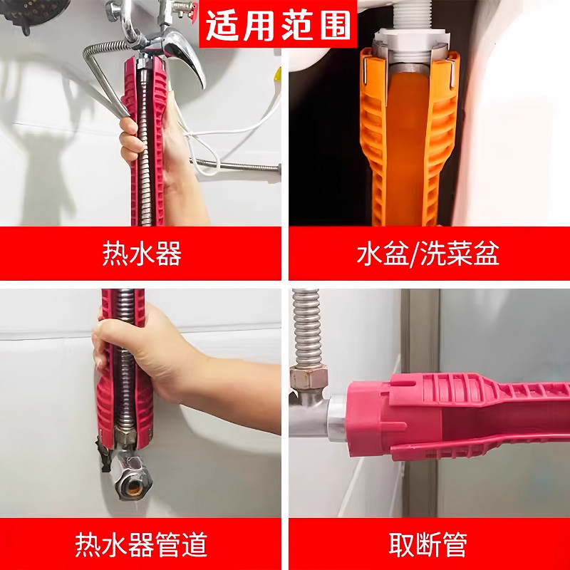 水槽扳手卫浴专用八合一多功能洗脸盆水龙头水管拧松器,是一款专为卫浴安装与维修设计的实用工具。集八种功能于一体,可轻松应对洗脸盆、水槽、水龙头及下水管的安装、拆卸与紧固作业。采用高强度合金钢材质,坚固耐用,防滑手柄设计握感舒适,操作省力。独特开口调节结构,适配多种规格螺母与管道,尤其适合狭窄空间使用。无论是家庭日常维护,还是专业装修施工,都能高效完成水管连接、密封调整等任务。一器多用,省去频繁更换工具的麻烦,是卫浴维修的理想助手,提升工作效率,保障安装质量。