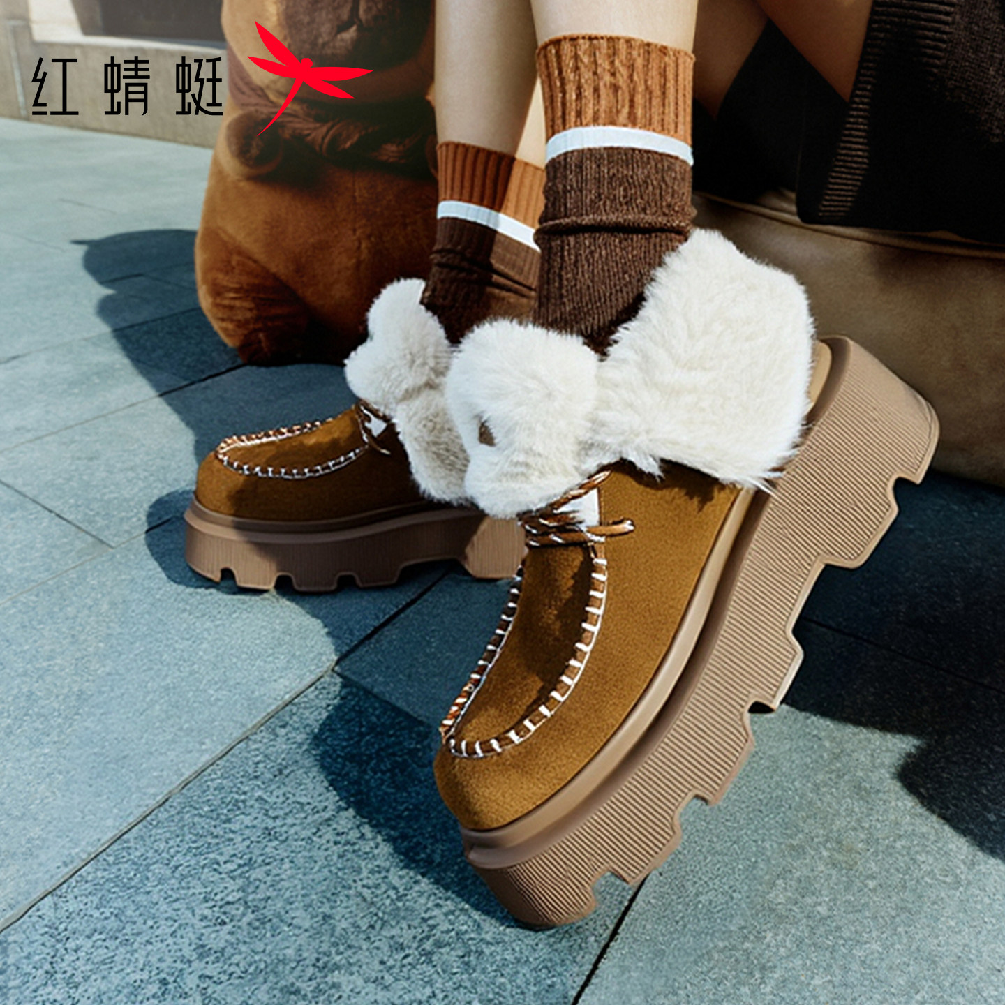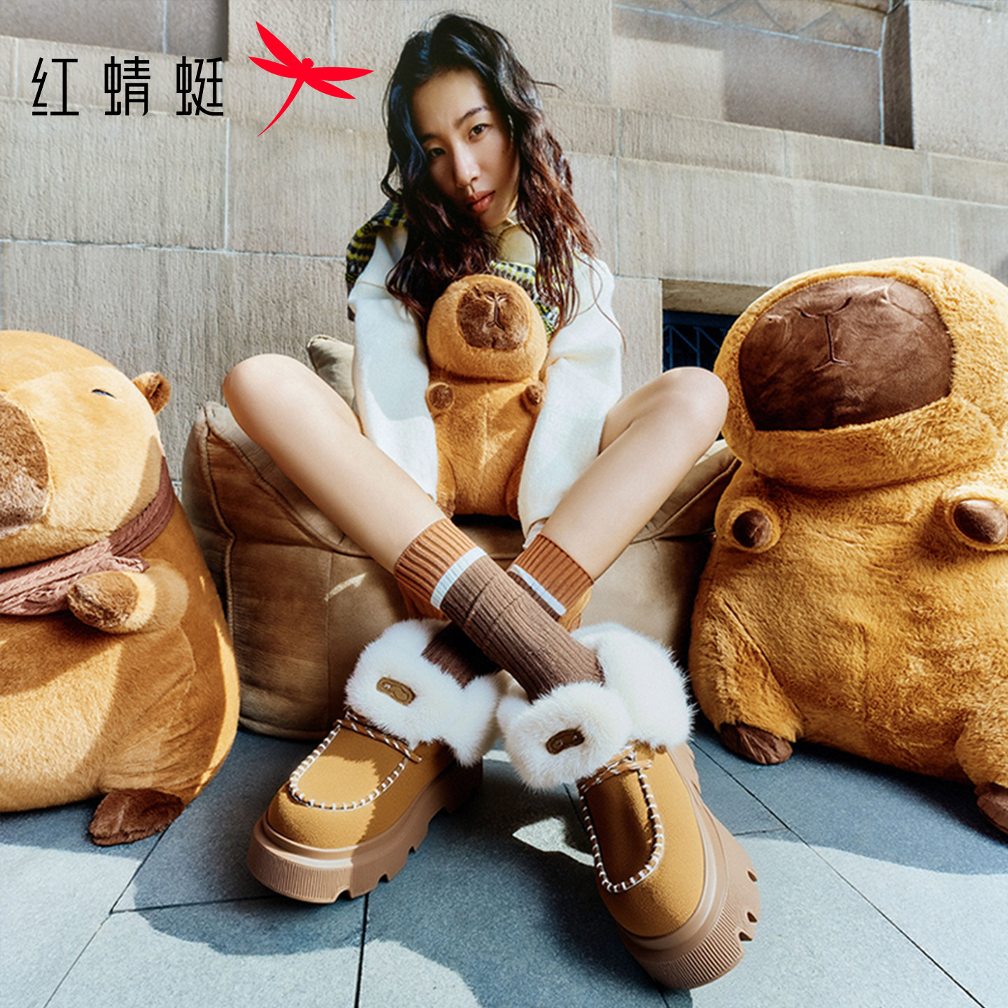 天猫红蜻蜓卡皮巴拉baby同款雪地靴秋冬女鞋厚底加绒保暖棉鞋休闲女靴
