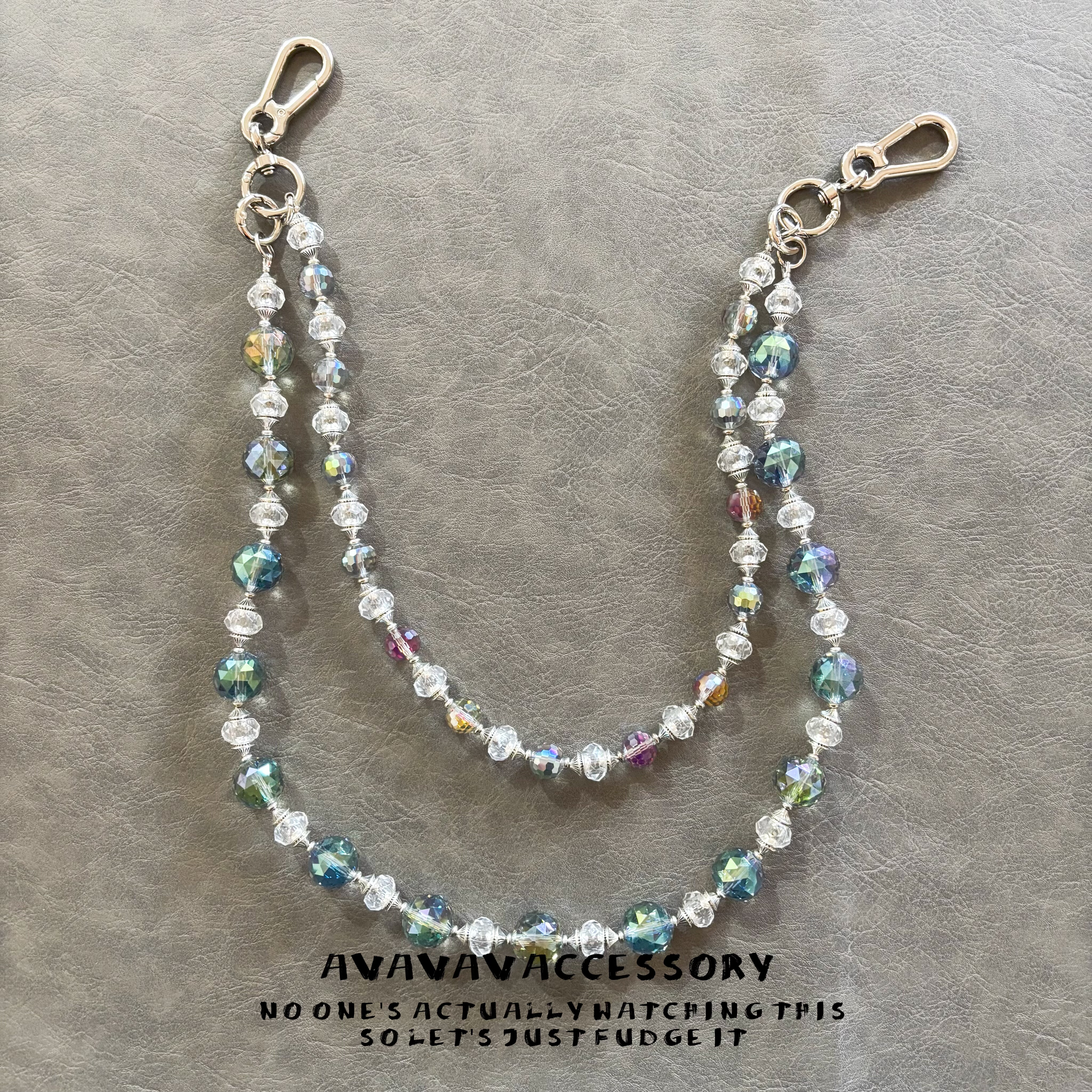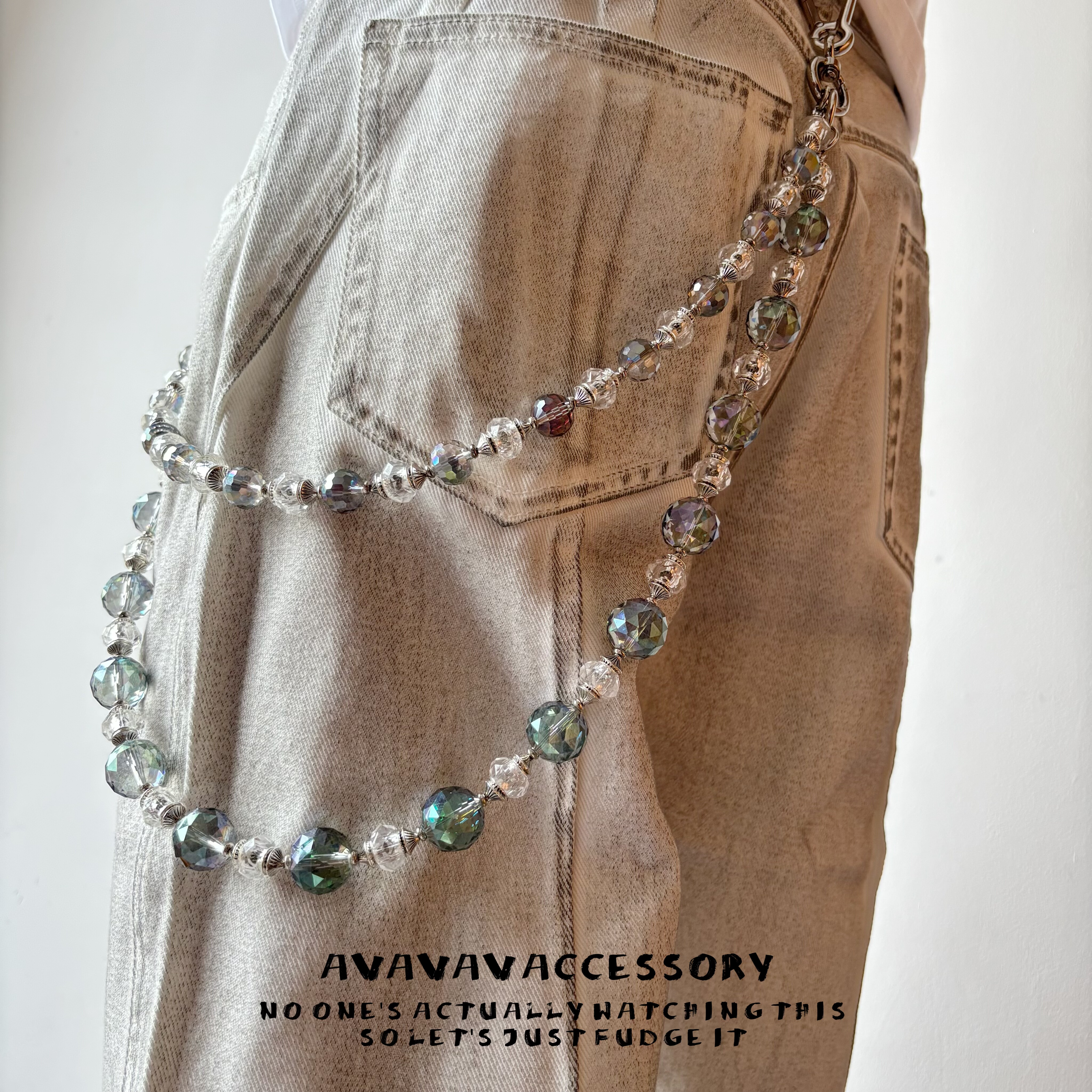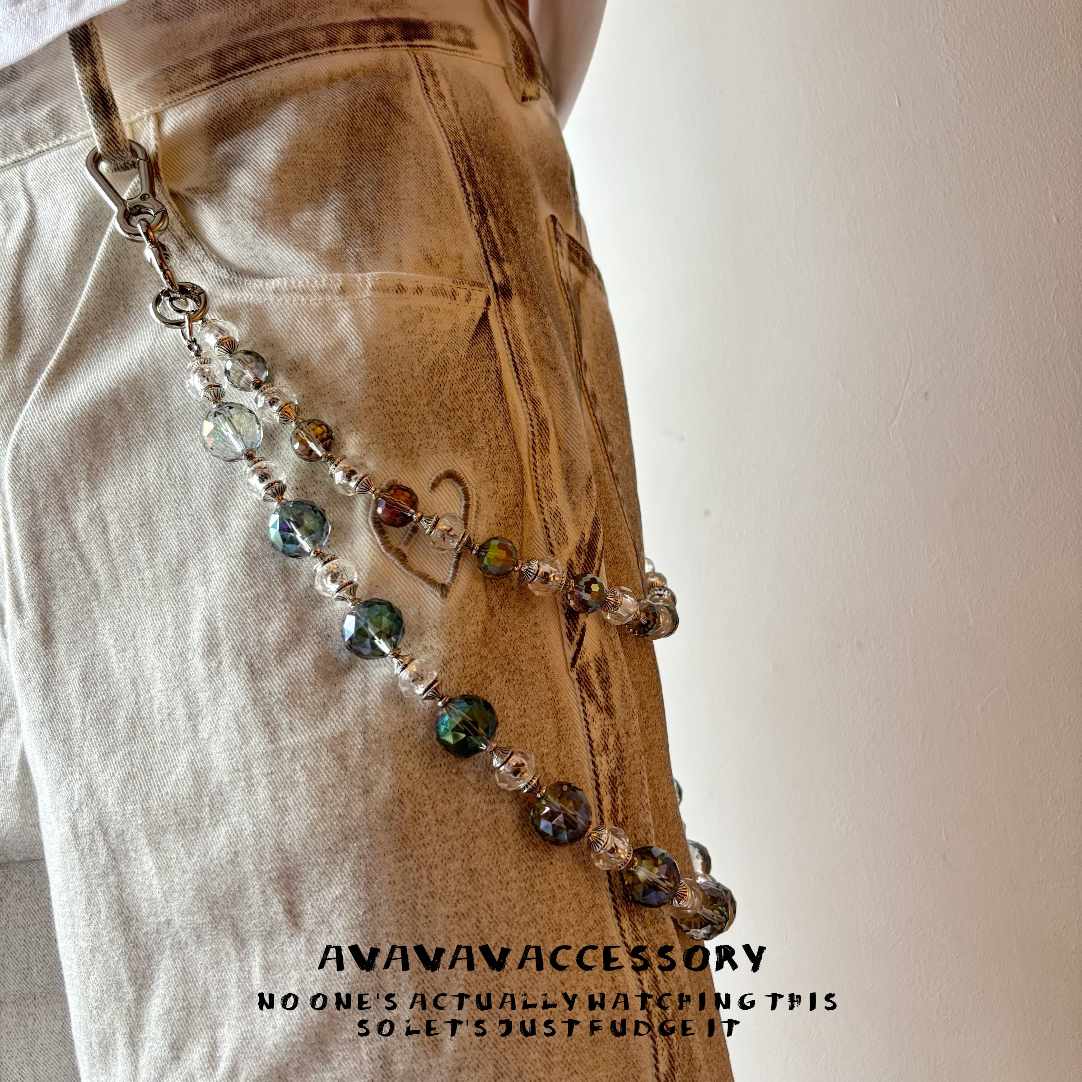 AVAVAVA小众设计感水晶珠子牛仔裤腰链,男女同款,融合时尚与个性,为日常穿搭注入亮眼细节。采用高品质炫彩水晶珠与金属链条组合,光泽流转,层次丰富,轻松点亮简约造型。无论是搭配牛仔裤、工装裤,还是作为包包挂链,都能 instantly 提升整体时尚感。轻盈佩戴舒适,细节精致考究,彰显独特审美。AVAVAVA以先锋设计打破常规,为追求个性表达的年轻人提供兼具艺术感与实用性的配饰选择,是街头潮流与小众美学的完美碰撞。