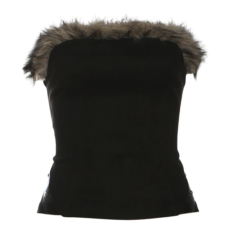 淘宝WEIRD PUSS 暗黑系朋克辣妹毛毛领抹胸背心女 毛毛腰带半身裙套装