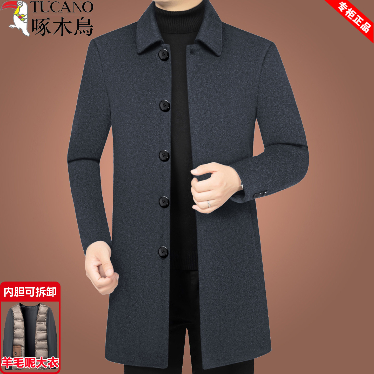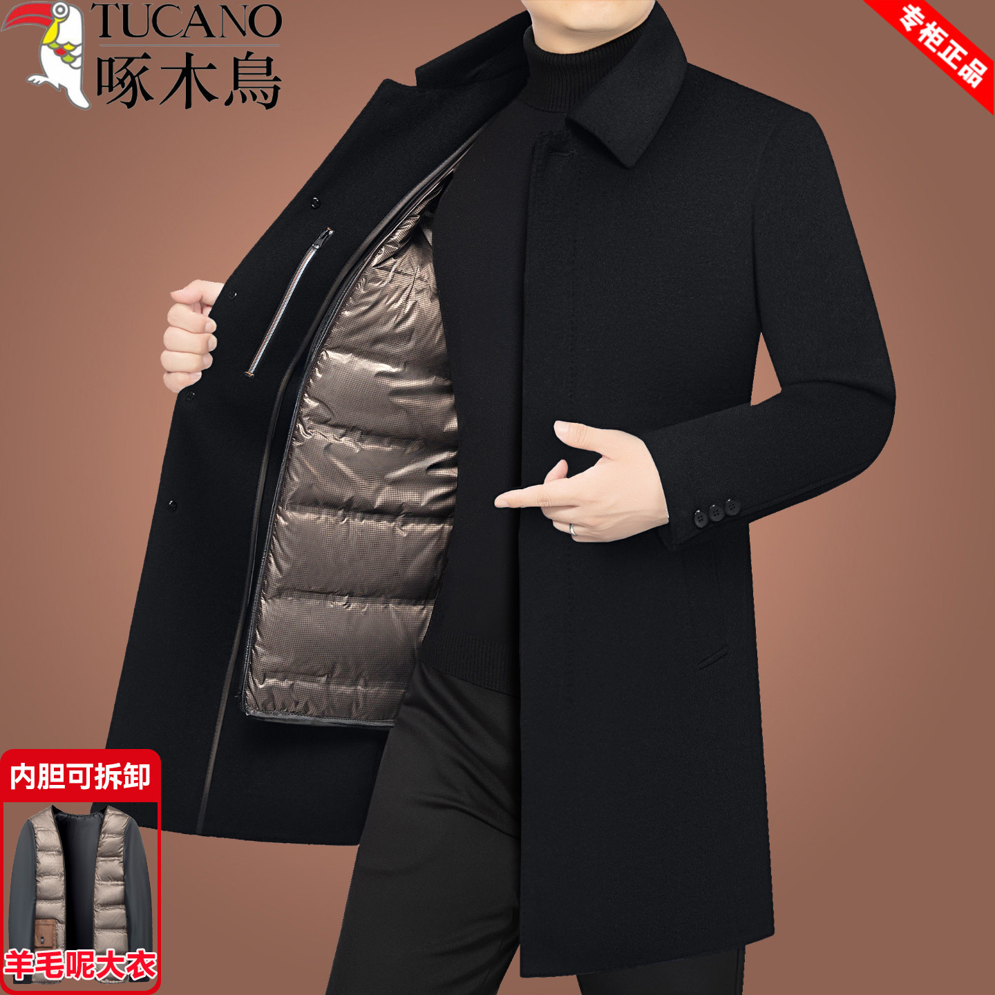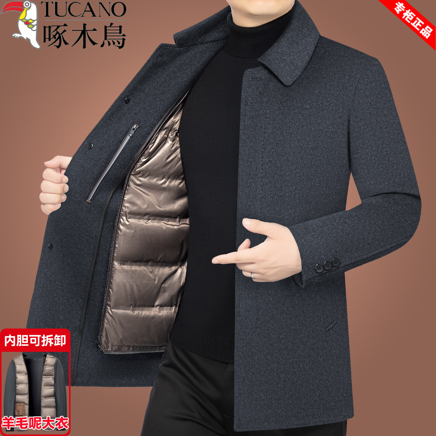 淘宝啄木鸟毛呢大衣男冬季商务中长款可拆羽绒内胆保暖外套中年爸爸装