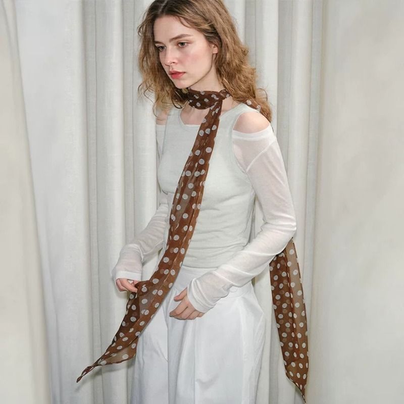 天猫棕色波点丝巾女2025新款高级感百搭法式系脖长条围巾薄款发带绑发