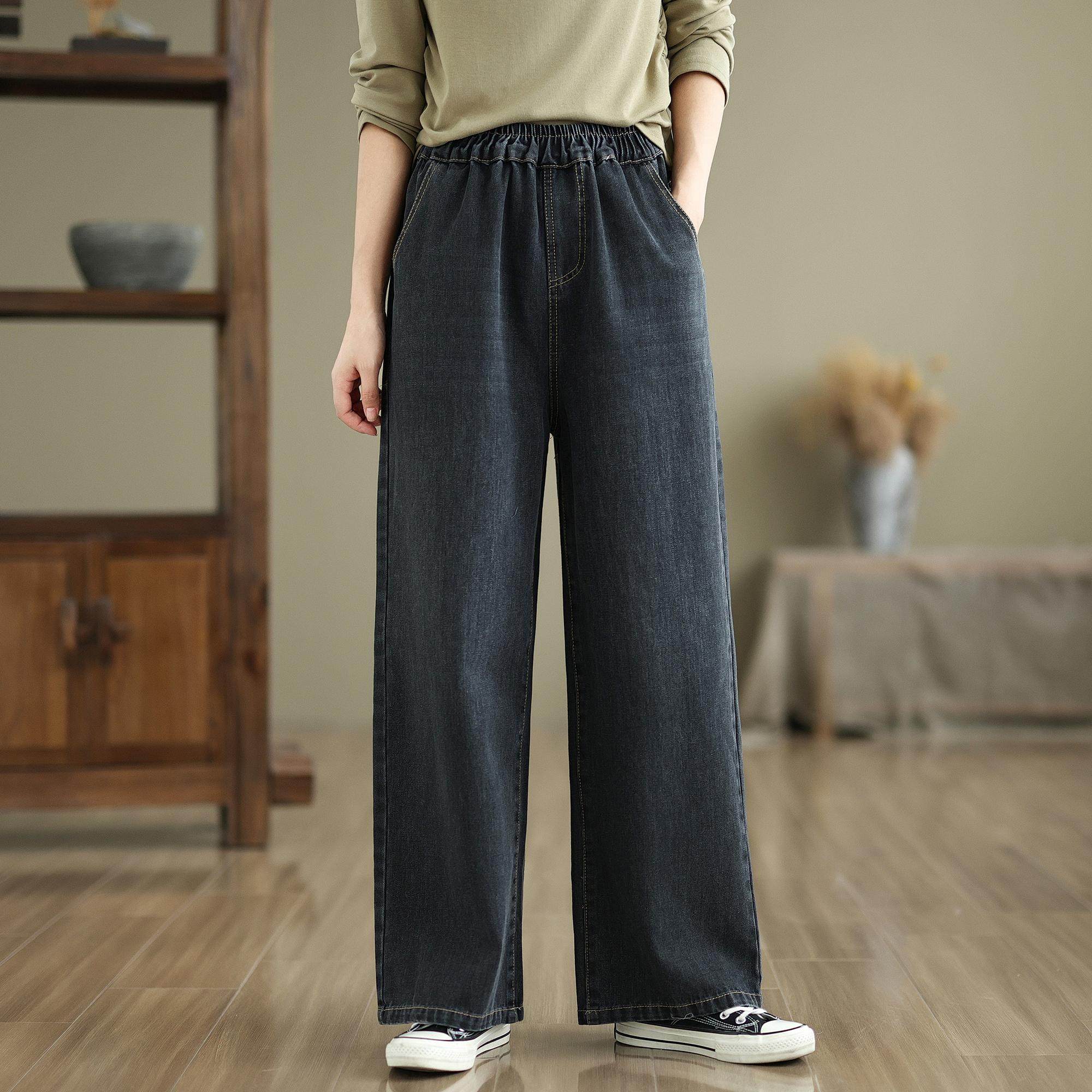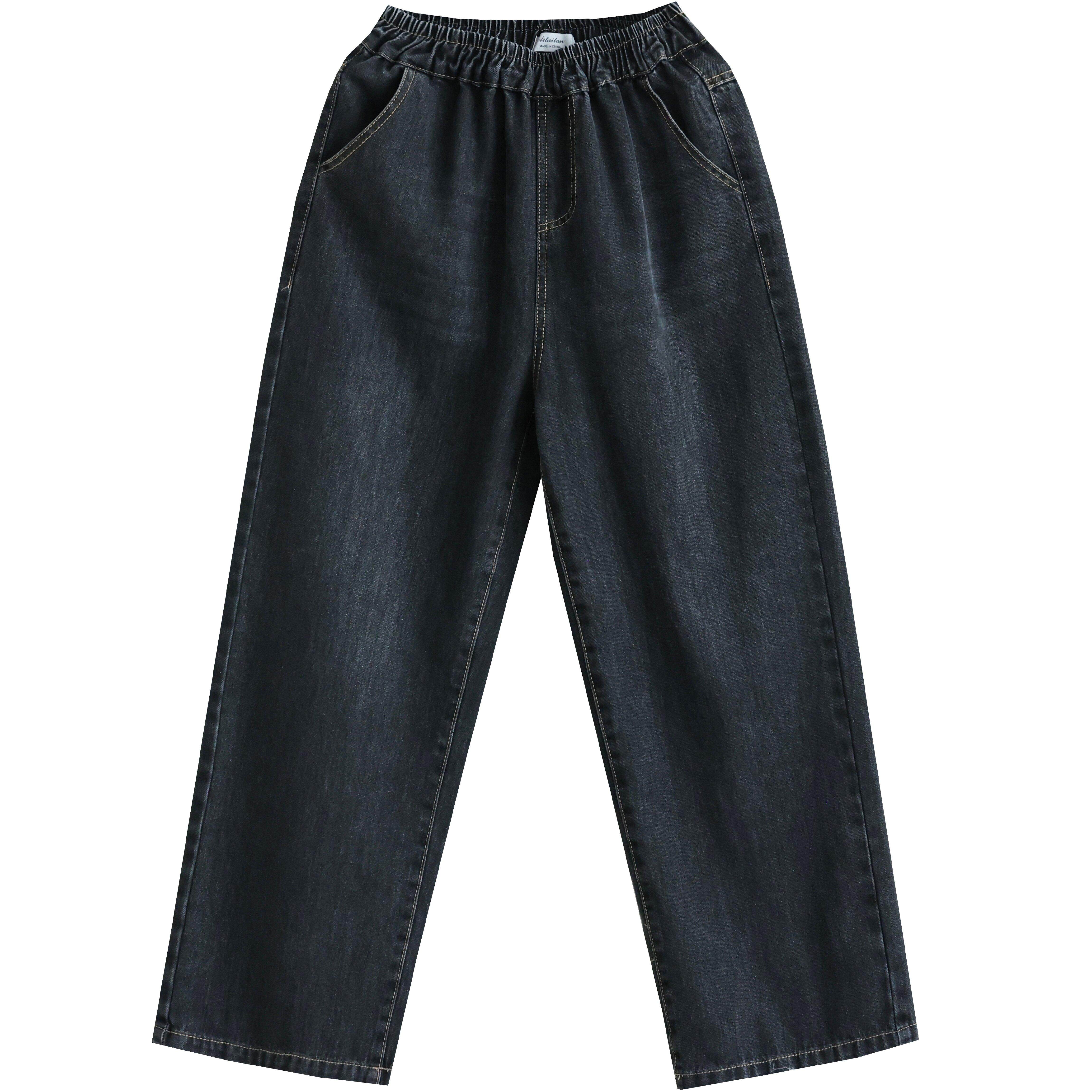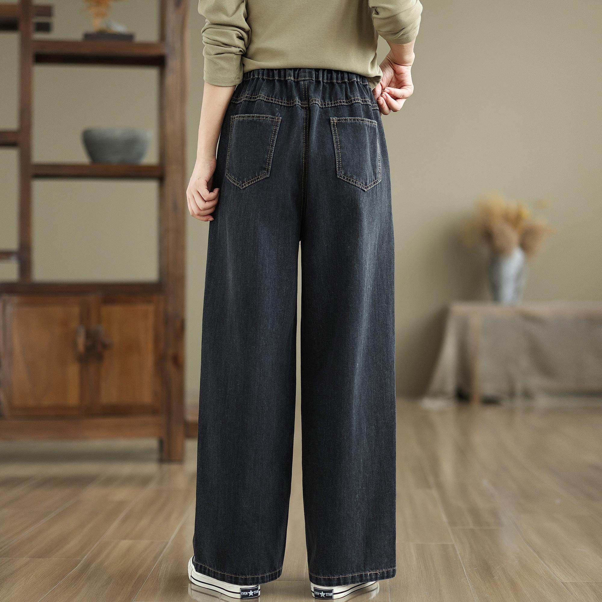 淘宝秋冬加绒阔腿牛仔裤女新款松紧腰显瘦直筒裤文艺水洗垂感加厚长裤
