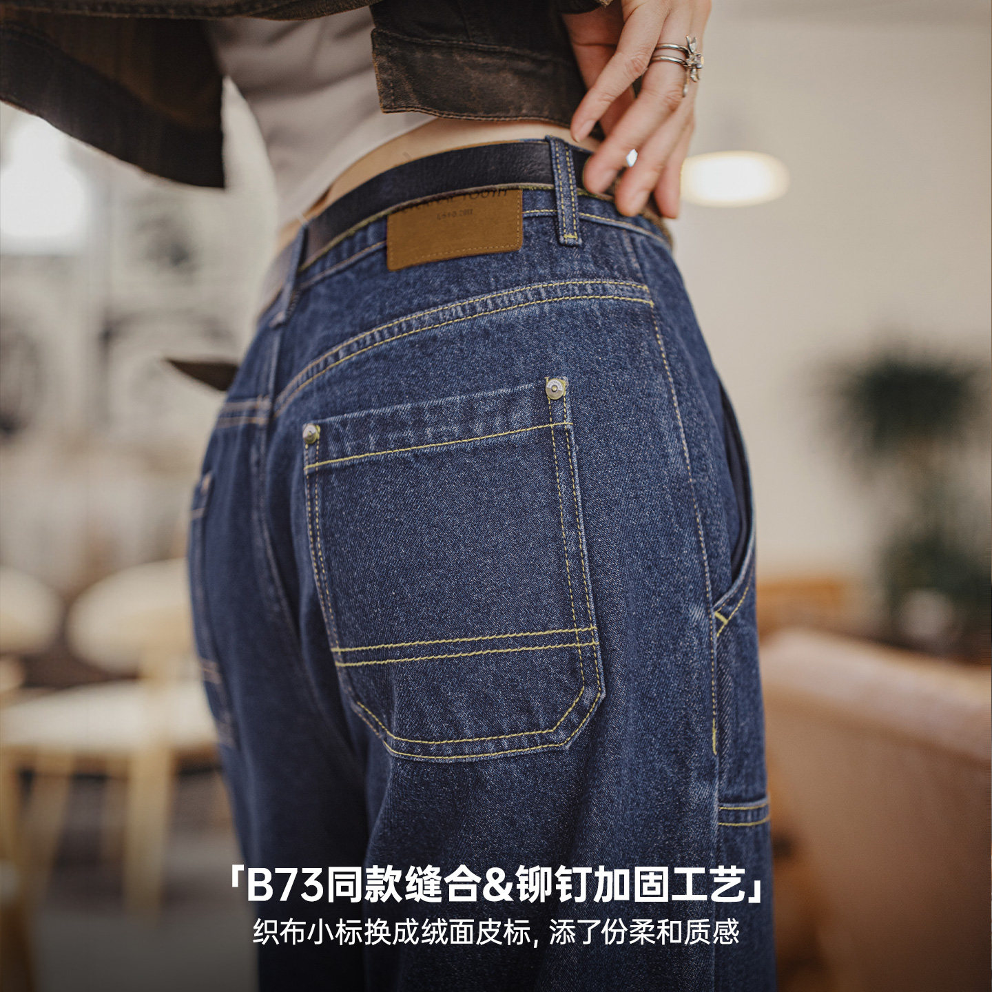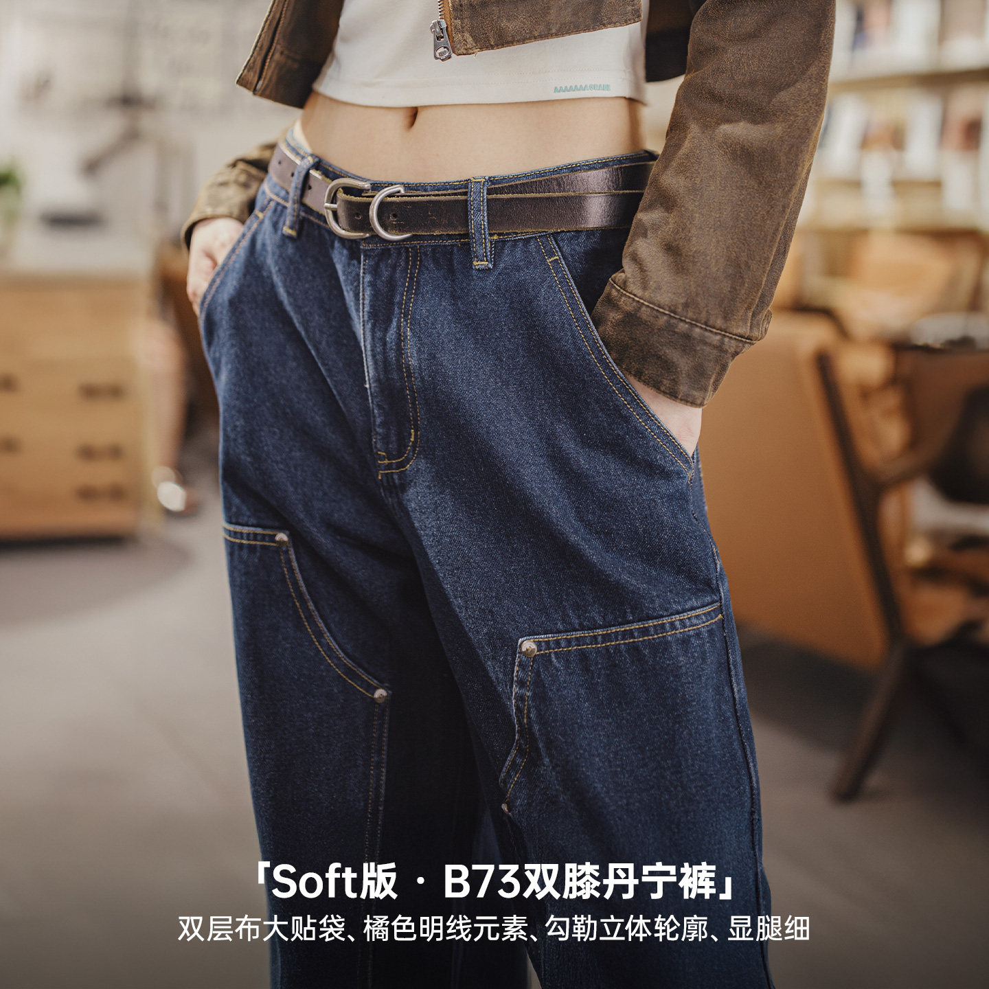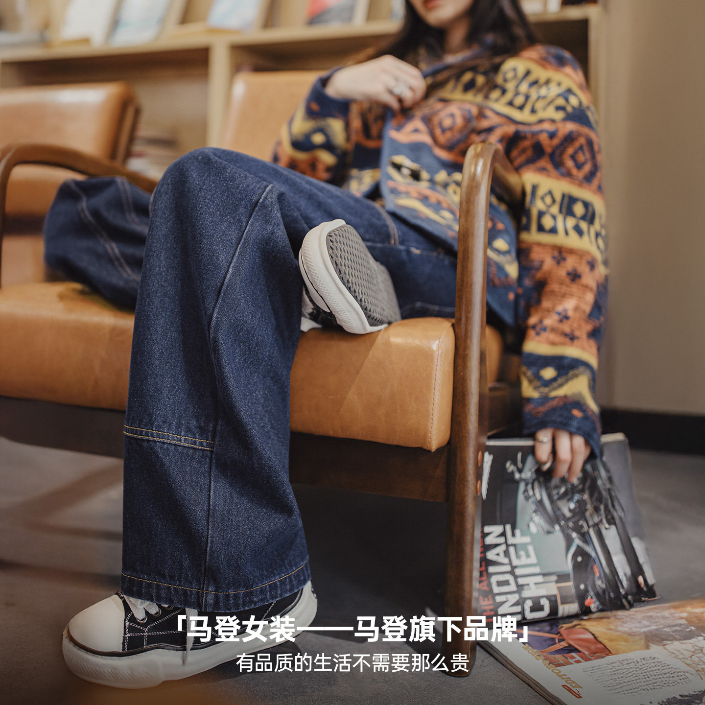 淘宝马登复古水洗丹宁蓝原色微宽松拼接双膝小直筒工装牛仔裤子女士秋