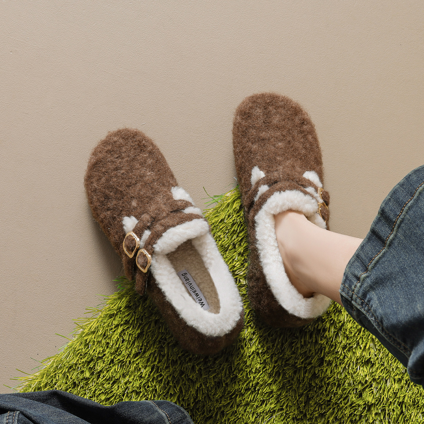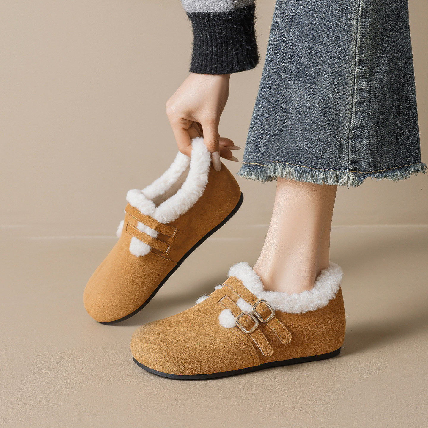 淘大码女鞋41到43加绒勃肯鞋软底舒适毛毛鞋呢子外穿保暖棉鞋乐福鞋