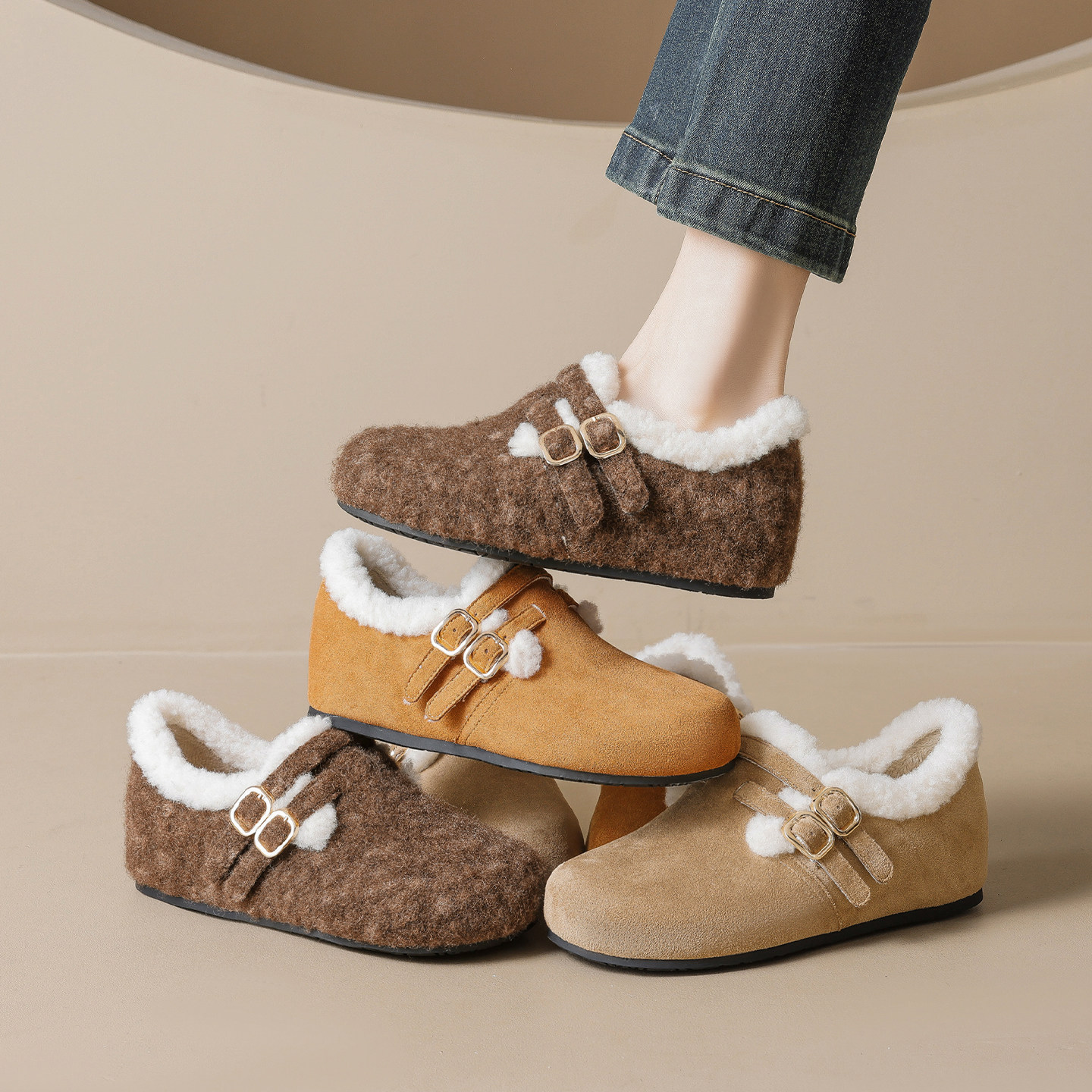 米霏~真皮勃肯鞋女冬季平底2026新款全包加绒棉鞋一脚蹬大码女鞋