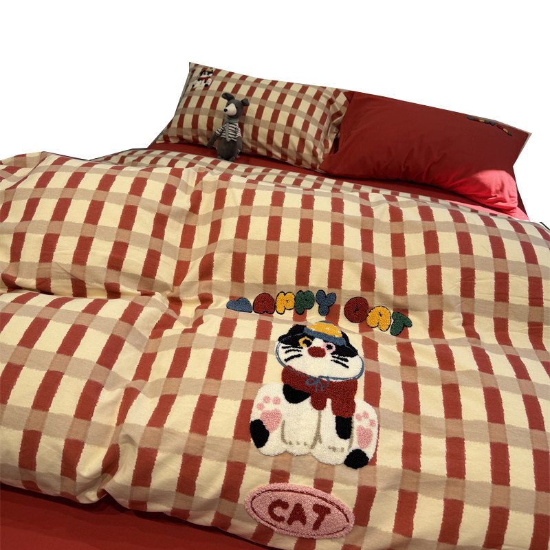 淘宝卡通毛巾绣猫咪红条纹磨毛四件套全棉纯棉被套秋冬加厚保暖1.5米