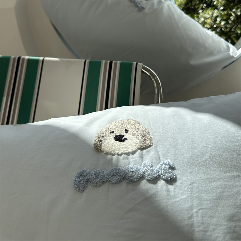 这款100S高支磨毛毛巾绣蓝色小狗狗四件套,精选优质全棉材质,触感柔软亲肤,透气性佳。采用高支高密工艺,面料细腻顺滑,耐用不易起球。独特的磨毛处理赋予织物温暖绒感,特别适合秋冬季节使用,保暖舒适。被套与枕套上精致刺绣蓝色小狗狗图案,萌趣可爱,为卧室增添温馨童趣。适用于1.5米或1.8米床型,尺寸齐全,贴合度高。四件套包含被套、床单、枕套,搭配协调,实用美观。无论是自用还是馈赠亲友,都是提升睡眠品质的理想选择,让每晚安睡如拥宠相伴。