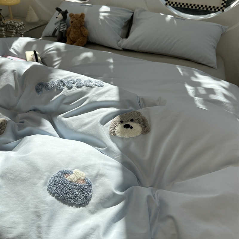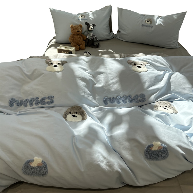 淘宝100s高支磨毛毛巾绣蓝色小狗狗四件套全棉纯棉1.5m1.8米秋冬保暖