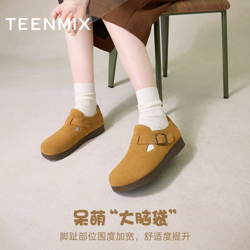 天猫天美意复古厚底贝果勃肯鞋全包休闲鞋女鞋子加绒毛毛鞋一脚蹬单鞋