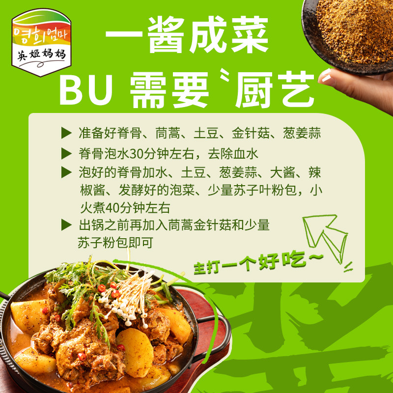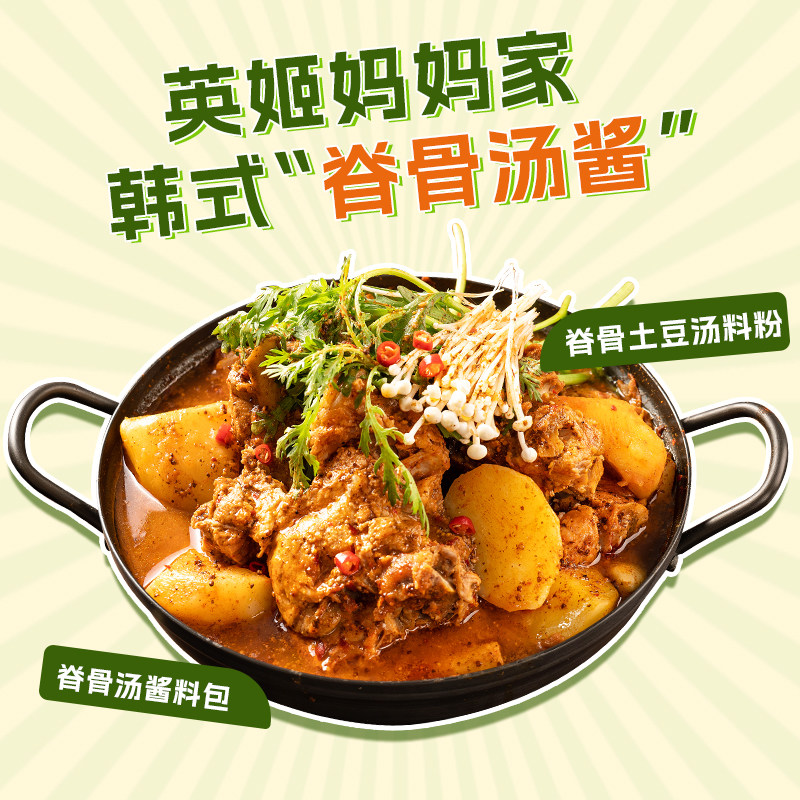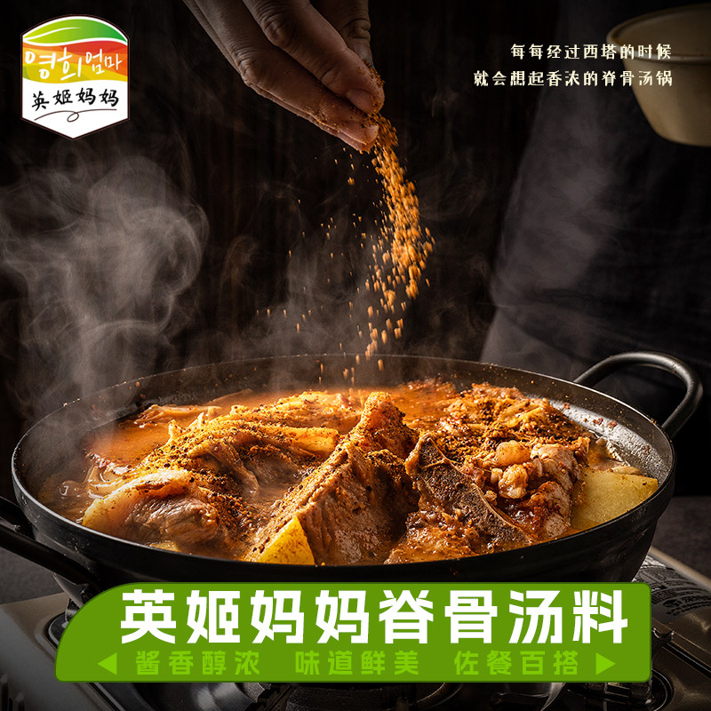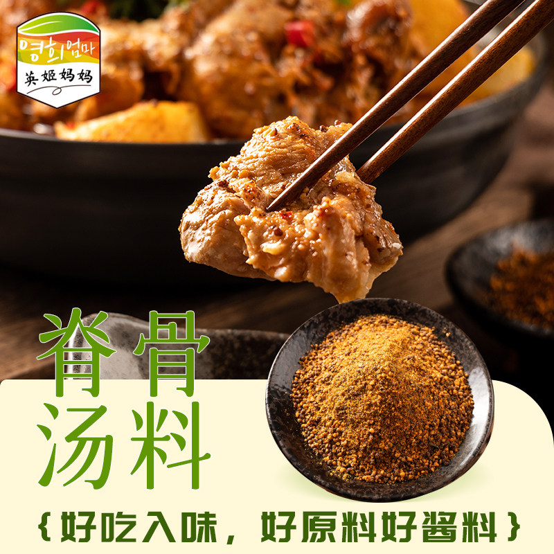 英姬妈妈韩国脊骨土豆汤调料,精选优质苏子粉与传统韩式香料精心调配,还原地道韩式脊骨土豆锅的浓郁风味。只需简单炖煮,即可轻松享受汤鲜味美、骨肉酥烂的经典韩餐体验。精选食材,无人工添加剂,健康安心。适用于脊骨、土豆、金针菇等食材,搭配米饭更添满足感。现购买满58元即享包邮优惠,足不出户品尝正宗韩式家常美味,让英姬妈妈调料为您的餐桌增添温暖与幸福滋味。适合家庭聚餐、朋友小酌,轻松做出餐厅级美味,尽享韩式料理的醇香与温情。
