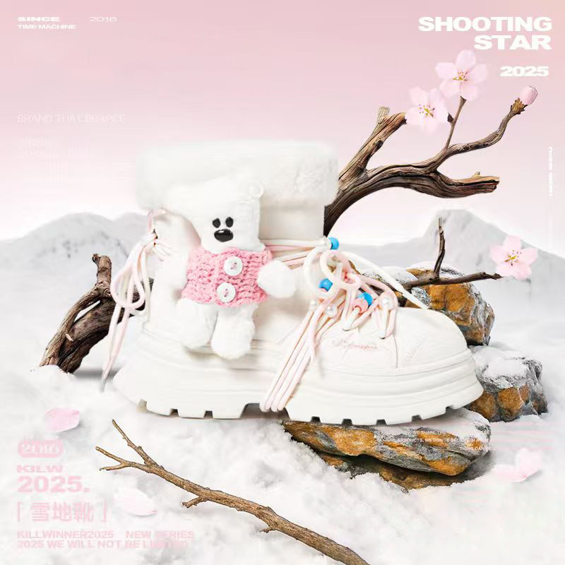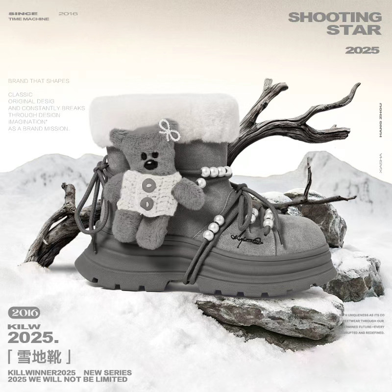 【赠小熊玩偶】KILLWINNER厚底雪地靴,冬季加绒保暖女鞋,融合潮流设计与实用功能。采用优质毛绒内里,360°锁温保暖,抵御严寒;加厚橡胶防滑大底,稳固耐磨,轻松应对冰雪路面。高帮设计贴合脚踝,防风防雪,兼顾舒适与时尚。简约百搭的潮牌KW标识,彰显个性品味。无论是日常通勤还是冬日出行,都能轻松驾驭。现购买即赠可爱小熊玩偶一只,温暖加倍,心意满满。KILLWINNER,为冬日注入潮流温度,陪你踏雪而行,温暖每一步。