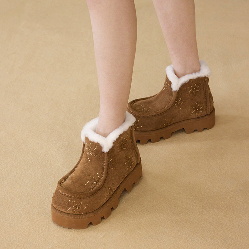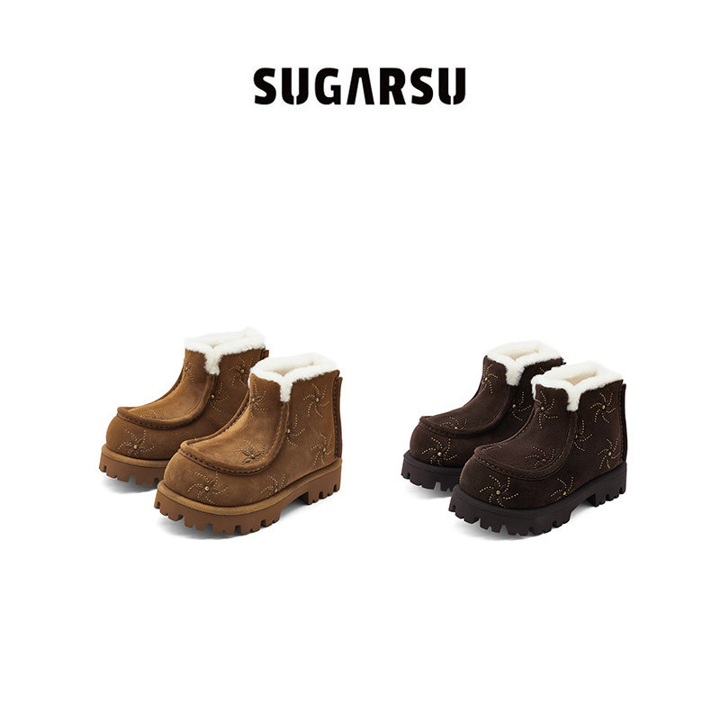 SUGARSU酥履2023秋冬季新款加绒毛毛厚底保暖中筒雪地靴,专为都市女性打造温暖与时尚兼具的冬日穿搭。采用柔软亲肤的仿羊羔绒内里,360°全方位锁温,有效抵御严寒;高弹厚底设计不仅提升舒适度,更增添视觉显高效果。鞋面选用优质磨砂皮材质,搭配经典袋鼠鞋型,简约百搭,轻松驾驭各种秋冬造型。中筒剪裁贴合腿部线条,防风保暖的同时彰显优雅气质。防滑耐磨橡胶大底,抓地力强,雨雪天出行更安心。无论是通勤、逛街还是户外赏雪,SUGARSU酥履雪地靴都是你冬季衣橱的贴心之选,温暖从“足”开始。