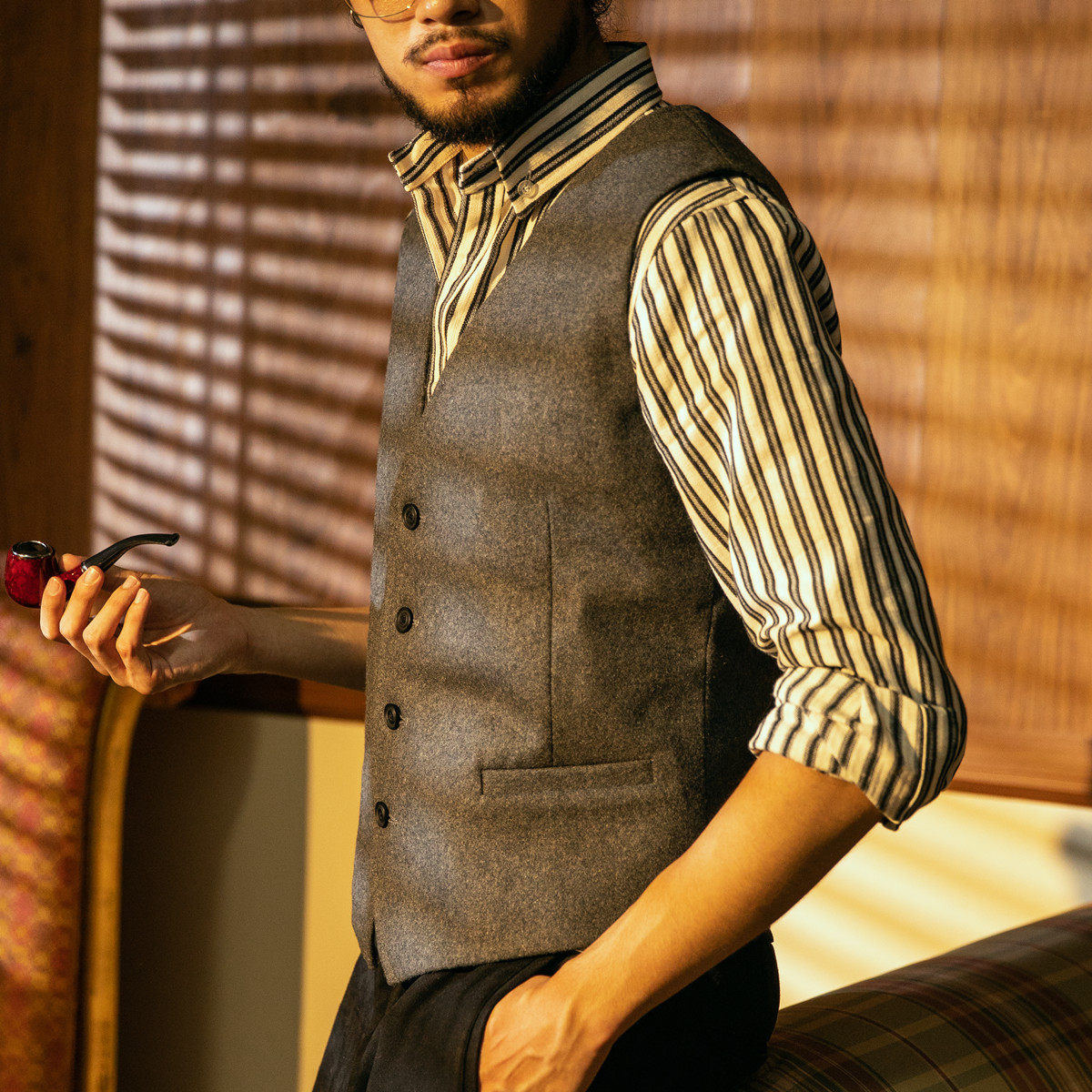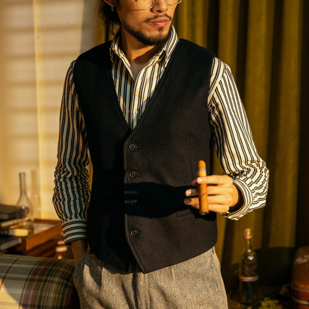 这款秋冬款羊毛呢马甲,采用高品质羊毛呢面料,厚实保暖,适合寒冷季节穿着。经典英伦复古咔叽风格设计,融合传统西装马甲的剪裁,线条利落,彰显男士儒雅气质。加厚内里有效锁温,兼具时尚与实用性。可搭配衬衫、毛衣或大衣,轻松打造层次丰富的冬日造型。无论是通勤、休闲还是出席正式场合,都能展现沉稳内敛的绅士风度。精致纽扣与贴袋细节,尽显匠心工艺。多色可选,百搭耐看,是男士秋冬衣橱不可或缺的保暖单品,兼具风度与温度,演绎复古摩登新风尚。