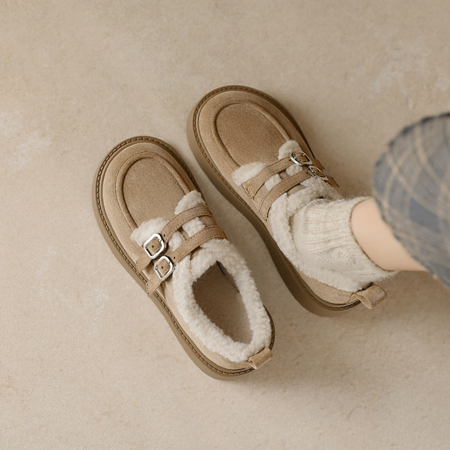 专柜2025年新款冬季真皮勃肯鞋女毛绒内里双扣带圆头保暖加绒棉鞋