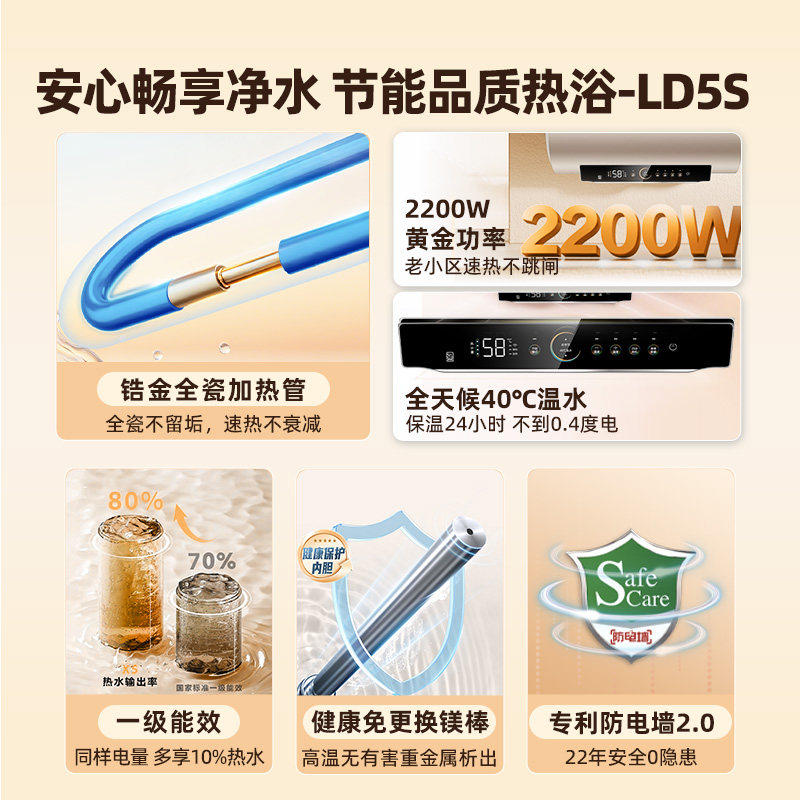海尔统帅LD5S电热水器,专为家庭洗浴设计,提供50升与60升两种容量选择,满足不同家庭需求。采用高效节能技术,达到国家一级能效标准,加热迅速且保温持久,有效降低能耗。内置金刚三层胆,抗腐蚀、耐高温,延长使用寿命。配备多重安全防护系统,包括防电墙、防干烧、防超压等,使用更安心。简约外观适配多种卫生间风格,支持智能预约加热,节能环保又便捷。统帅作为海尔旗下高性价比品牌,LD5S以可靠品质与贴心设计,为用户带来舒适、安全的洗浴体验,是家用热水器的优选之选。