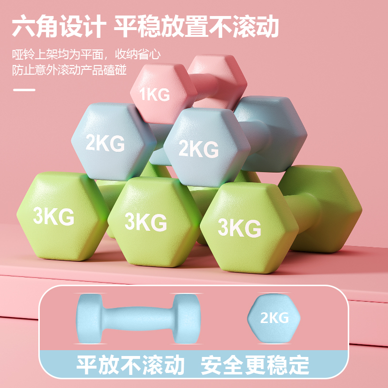 天猫哑铃女士健身家用2kg一对实心浸塑铸铁金属六角哑铃举铁专业铁质