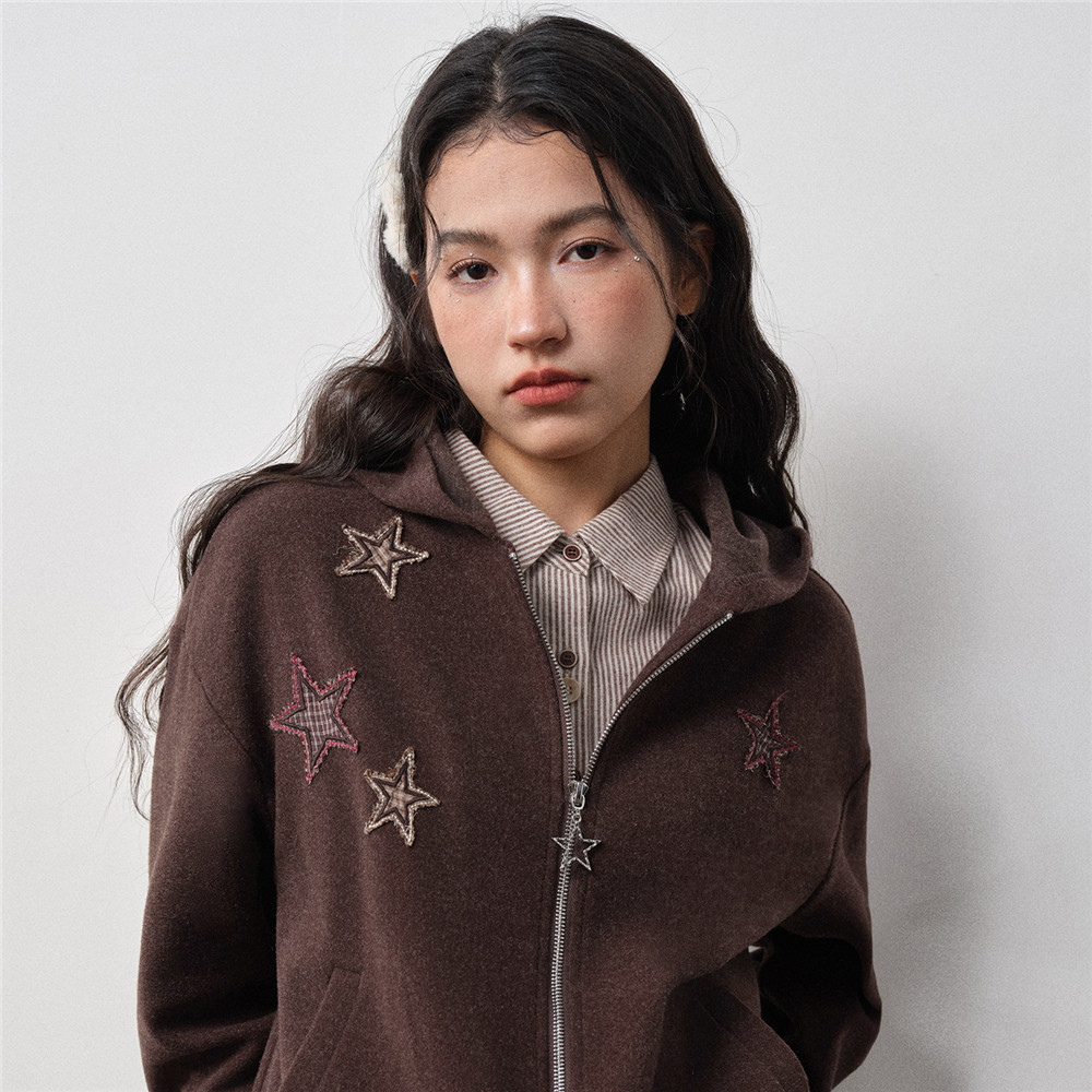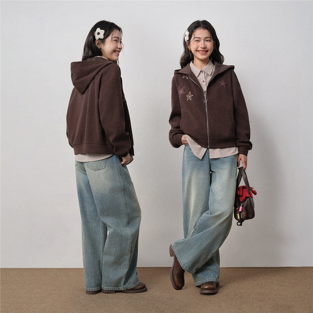 天猫设计师款佐丹奴女装2026年春磨毛星星贴布绣连帽卫衣外套18375825