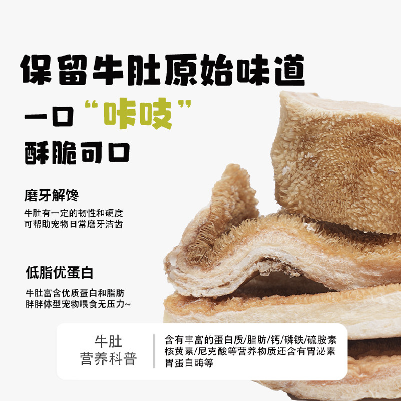 笨初初狗零食牛肚冻干磨牙棒,精选天然优质牛肚为原料,采用先进冻干工艺锁住营养与鲜味,无添加防腐剂、诱食剂,安全健康。产品质地酥脆,有效帮助狗狗磨牙洁齿,减少牙垢和口臭,同时温和刺激肠胃蠕动,促进消化吸收。富含天然蛋白质与氨基酸,营养丰富,适合作为日常训练奖励或互动零食。软硬适中,适合各年龄段犬只咀嚼,既满足狗狗天性,又呵护口腔与肠胃健康。笨初初坚持天然健康理念,为爱宠提供安心美味的零食选择,是主人信赖的优质宠物食品品牌。