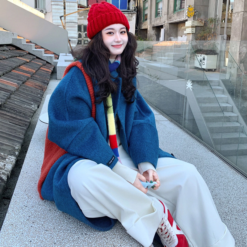 淘韩系V领阔形双面羊毛呢大衣女冬撞色连帽毛呢外套马甲两件套9496