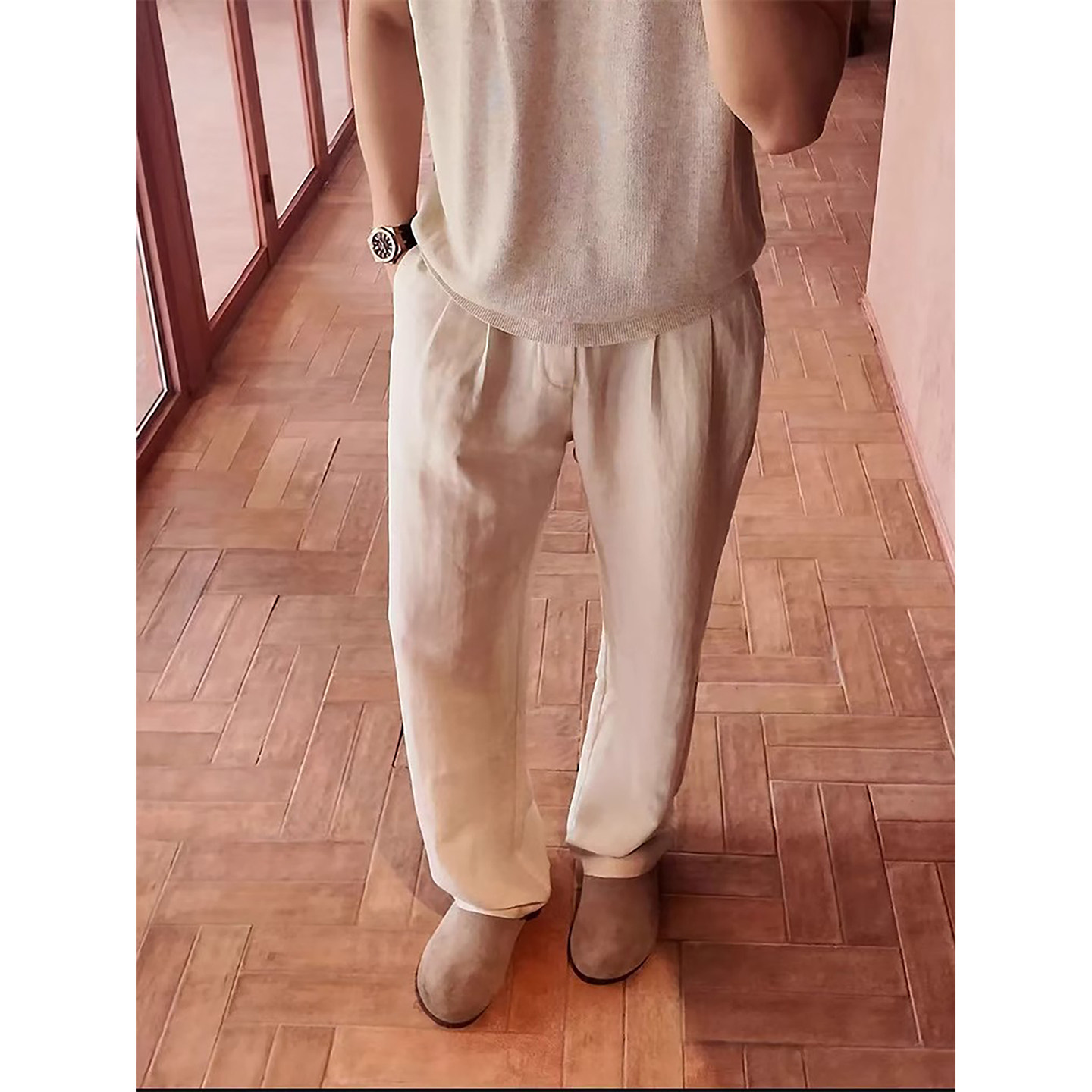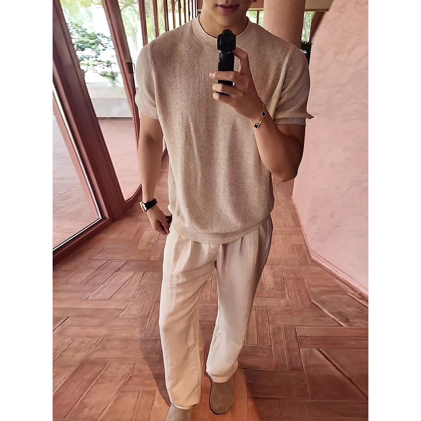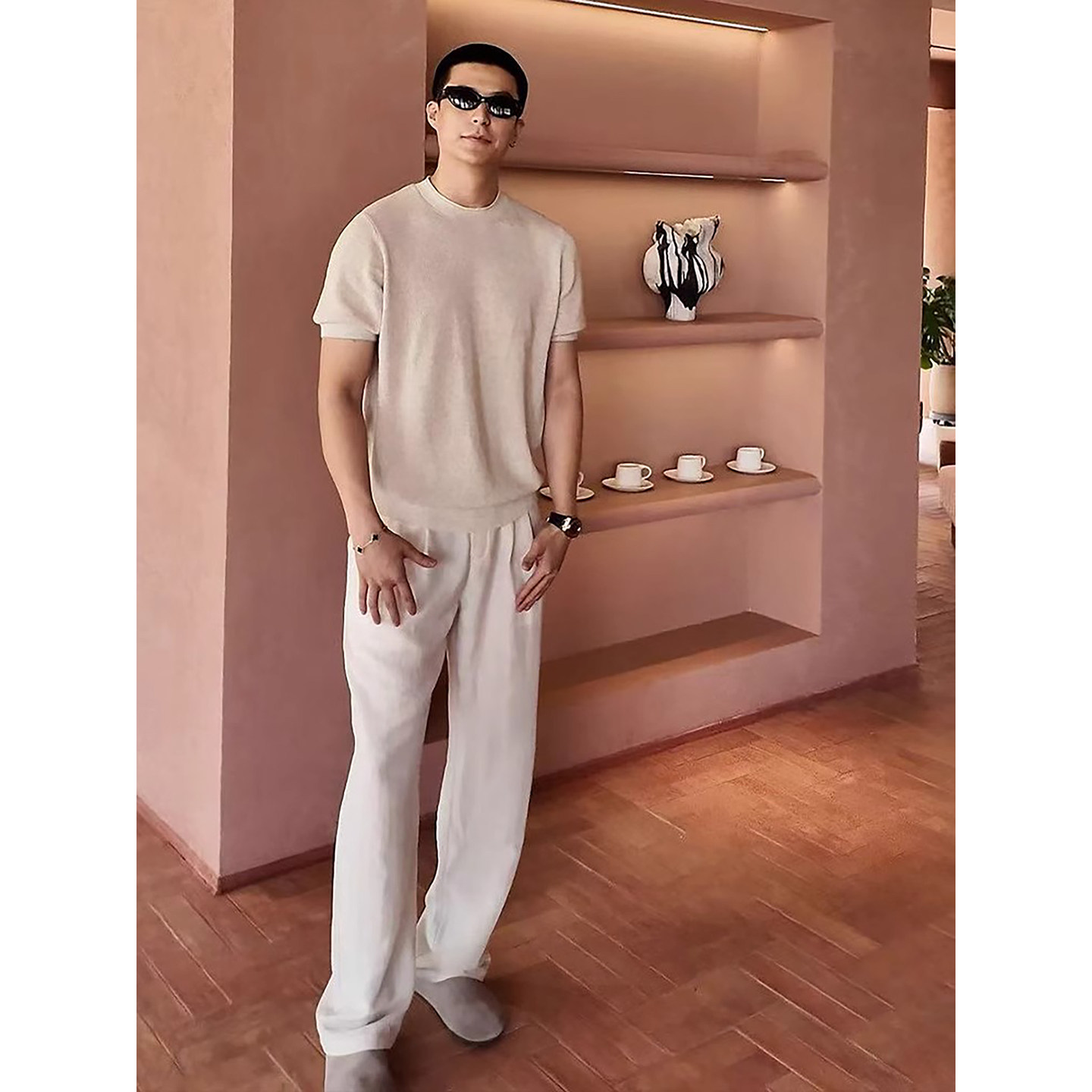 这套“老钱风”男装搭配以松弛感为核心,彰显成熟男士的低调品位。上身选用天然亚麻混纺针织T恤,质地透气亲肤,微宽松剪裁自然垂坠,呈现不经意的优雅。搭配一条垂感十足的轻奢休闲长裤,线条利落,色调沉稳(如燕麦色、深灰或藏青),凸显质感与高级感。整体造型简约而不简单,摒弃浮夸Logo,注重面料与细节,在随性中透出稳重气质。无论是周末出行还是轻商务场合,都能轻松驾驭,展现内敛自信的帅气风范,完美诠释“老钱风”所追求的 timeless elegance 与从容态度。