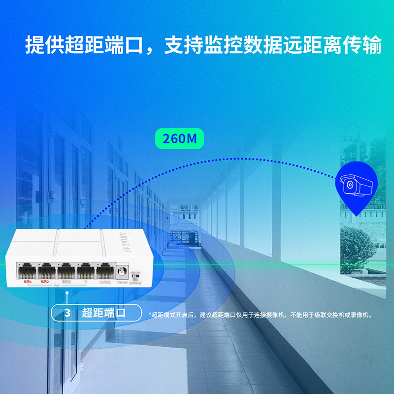 水星安防监控专用PoE交换机,专为摄像头组网设计,提供5口、8口、16口多种规格,支持百兆/千兆传输,满足企业、办公及家庭安防需求。采用48V国标PoE供电标准,单端口最大输出30W,可远程为摄像头等设备供电,简化布线,降低安装成本。支持超距传输(最远250米),搭配专用延长模式,有效解决远距离监控难题。内置智能供电管理,自动识别PD设备,防雷、过载保护设计,确保稳定运行。即插即用,无需配置,兼容主流摄像头品牌,是构建高效、安全监控系统的理想选择。