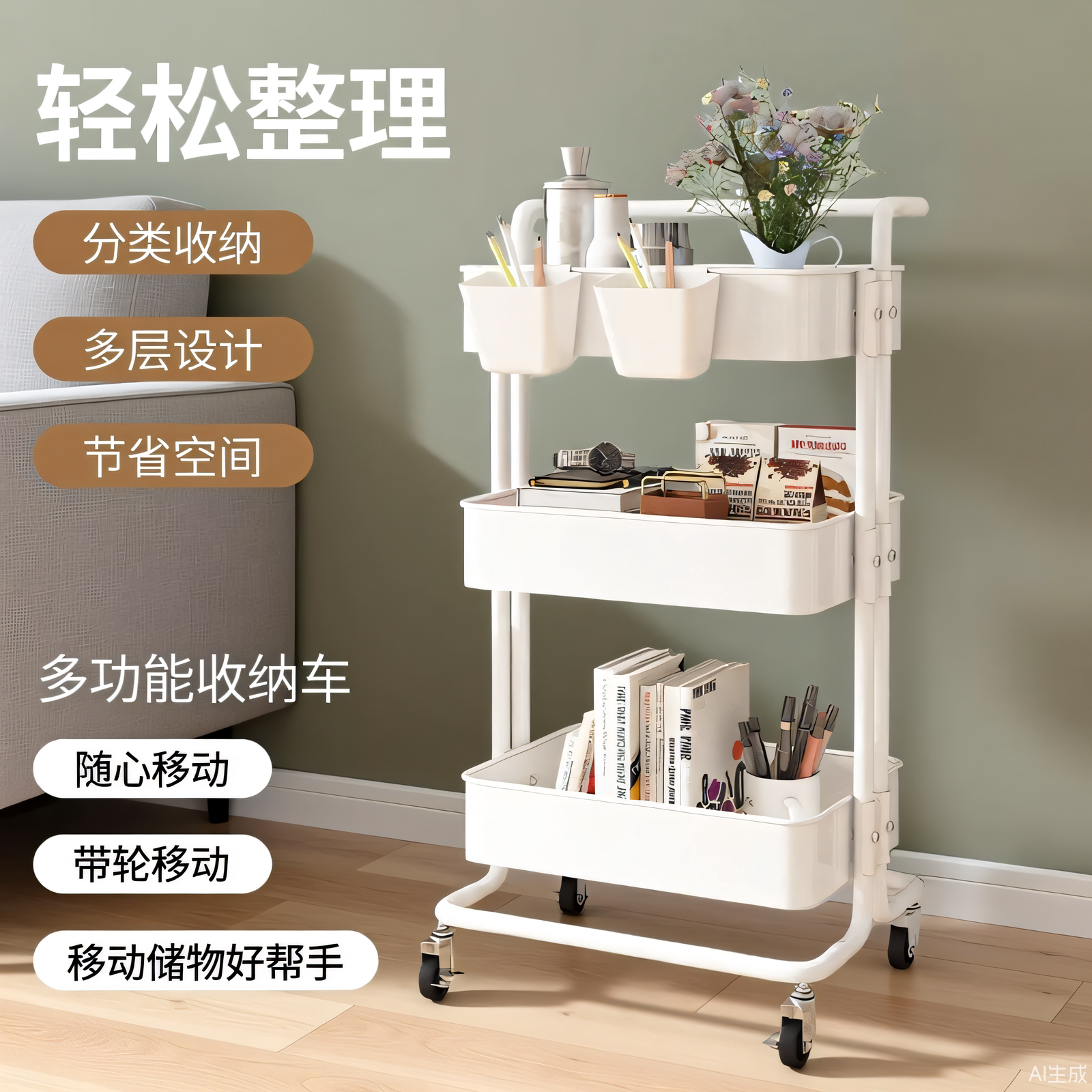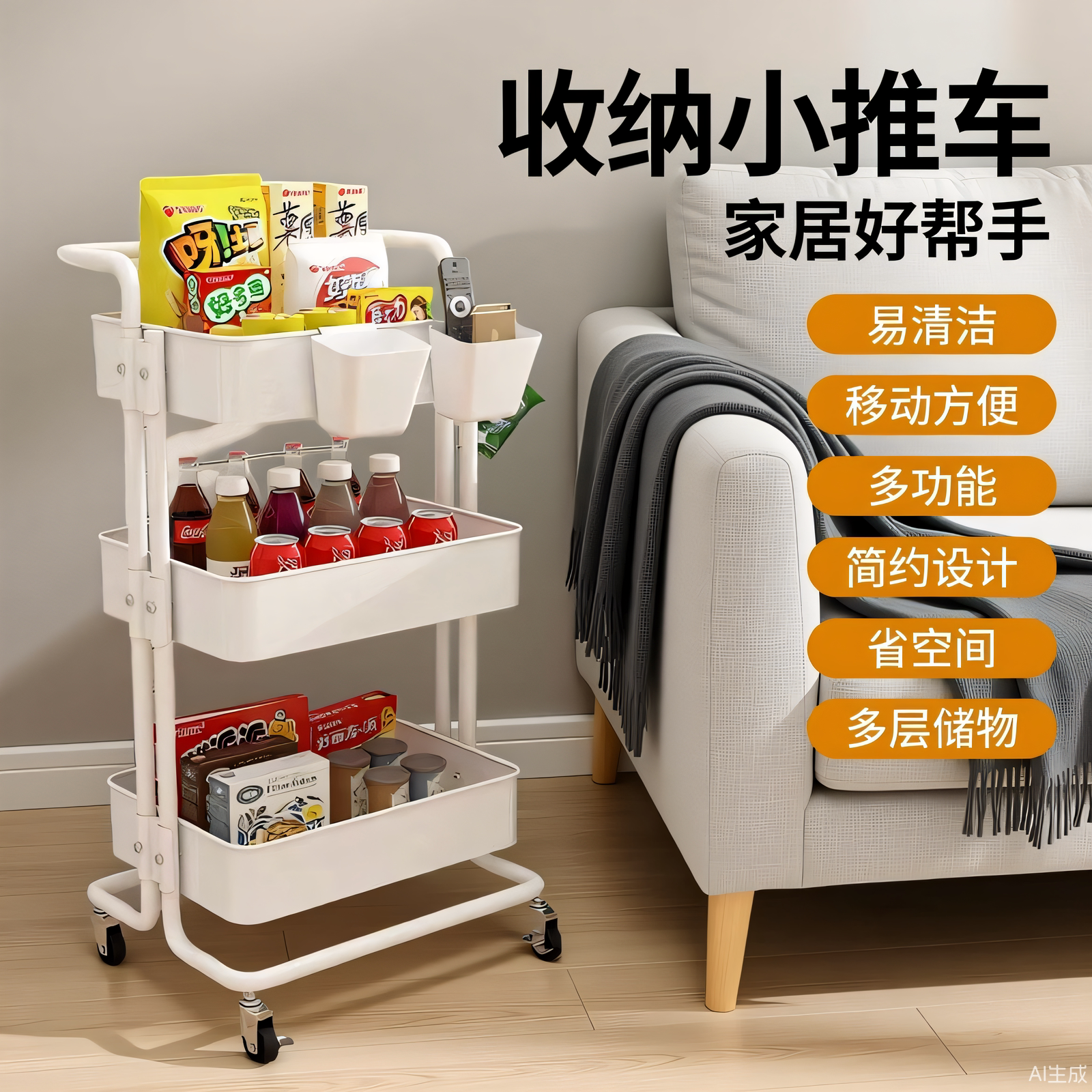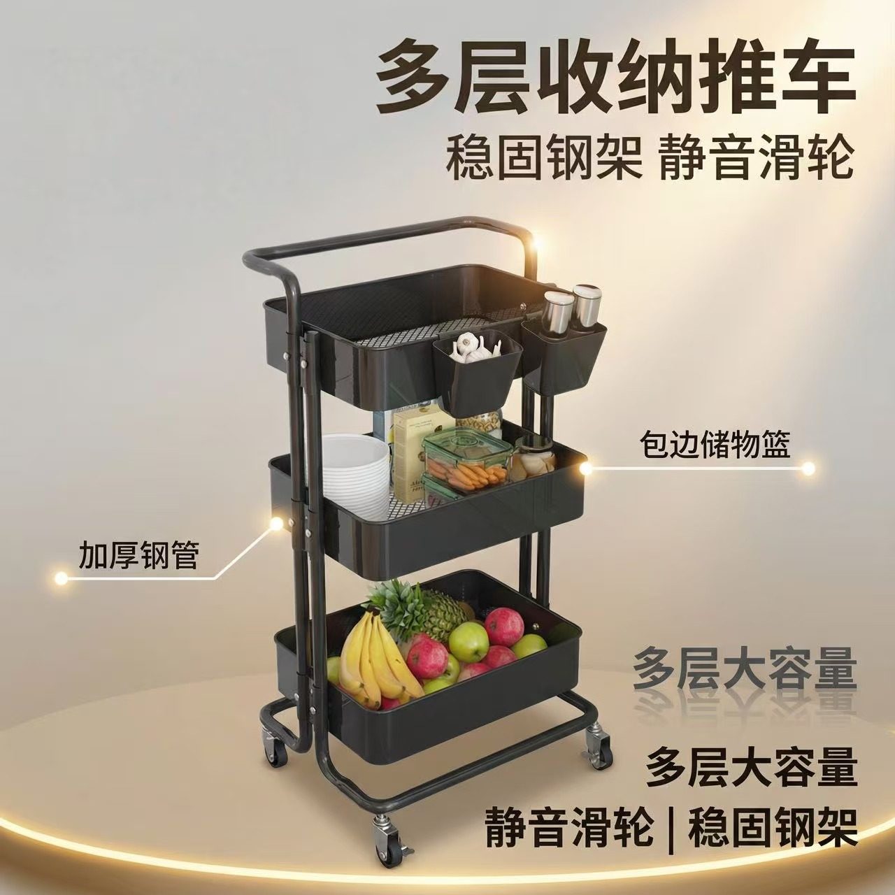 这款多功能小推车置物架,采用稳固金属框架与环保板材,承重力强,防锈耐用。多层设计充分利用垂直空间,适用于浴室、厨房、卧室等多个场景,轻松收纳零食、玩具、洗护用品、厨具等杂物,让空间整洁有序。底部配备静音万向轮,移动灵活,带刹车装置,停放稳固不滑动。层板高度可调节,满足不同物品收纳需求。简约时尚外观,轻松融入各种家居风格,既是实用收纳工具,也是空间点缀。无论是小户型扩容,还是临时置物需求,这款移动置物架都能高效解决收纳难题,提升生活便利性。